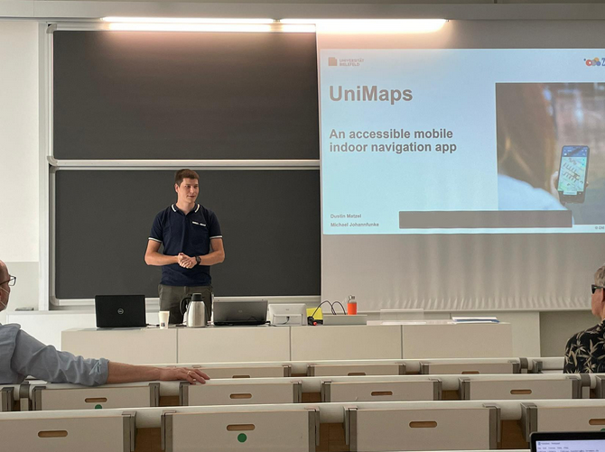On the topic "Digital solutions for inclusive mobility: solutions and accessible maps for indoor and outdoor mobility", Dustin Matzel presented a paper on the app UniMaps for accessible campus navigation. Mr. Matzel explained in particular the development process: students themselves are involved in the ongoing development of UniMaps and can thus directly adapt the app to their needs. Furthermore, possible problems with digital map generation, indoor navigation and accessible map display in the app and their solution in UniMaps were pointed out.