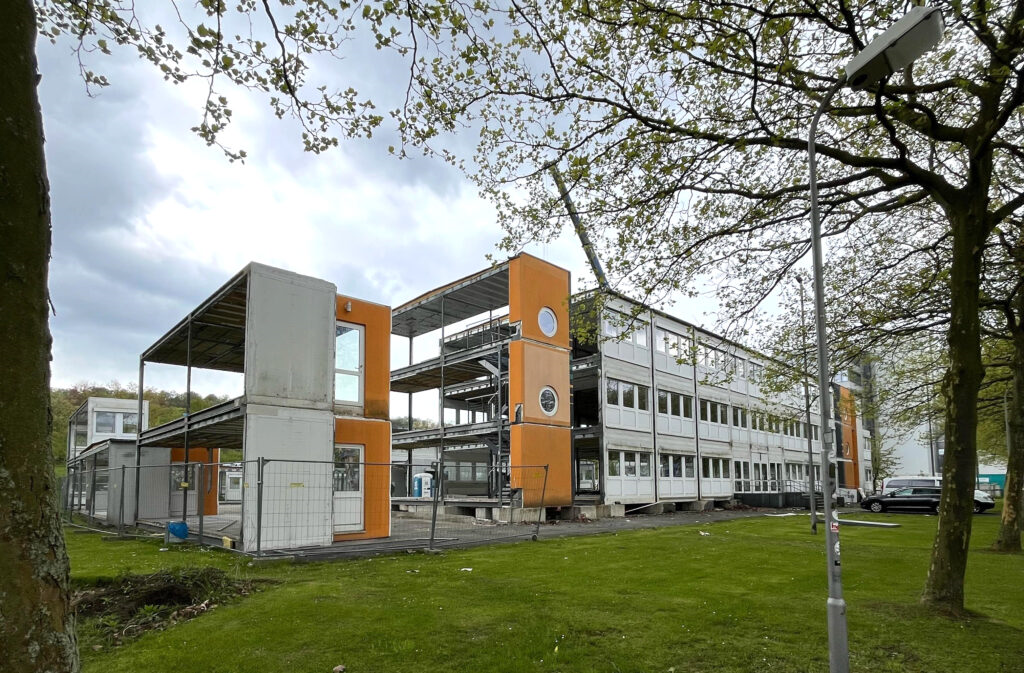 Das Gebäude Q östlich des Hauptgebäudes der Universität wird aktuell zurückgebaut. Das Gebäude wurde im Jahr 2008 zunächst als so genanntes „Mobilgebäude“ für das Forschungscluster CITEC auf der Fläche eines ehemaligen Verkehrsübungsplatzes der angrenzenden Schulen errichtet. Seitdem hat das modular zusammengesetzte Bürogebäude mit der Postanschrift „Ausstrahlung 1“ während seiner gut 15 Jahren Nutzungsdauer verschiedenen Einrichtungen der Universität Bielefeld eine interessante Adresse geboten.