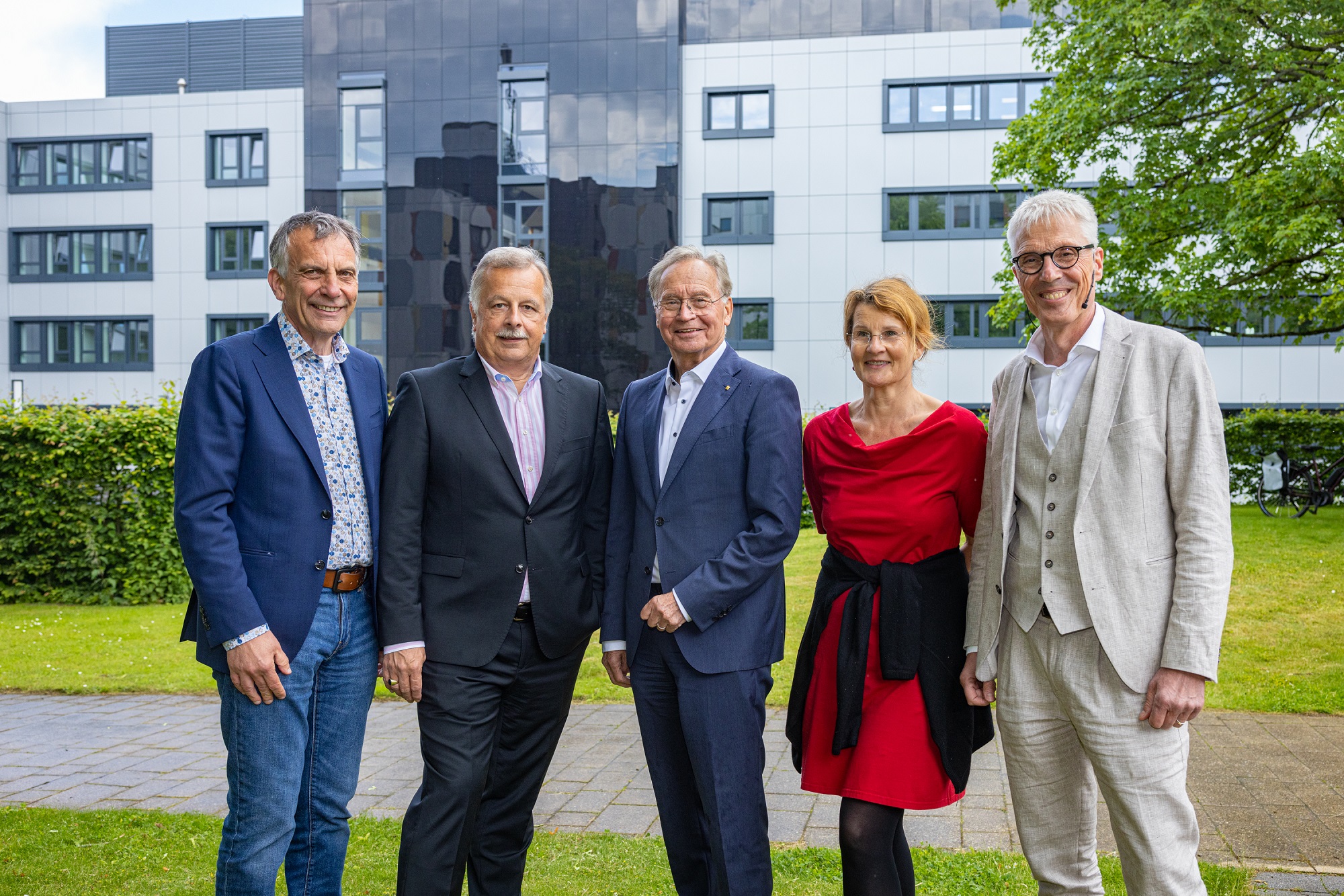 Rektor Prof. Dr.-Ing. Gerhard Sagerer, Bürgermeister Andreas Rüther, Ortwin Goldbeck, Dekanin Prof’in Dr. med. Claudia Hornberg und Kanzler Dr. Stephan Becker (v.l.) eröffneten das Gebäude R2 für die Medizinische Fakultät OWL.