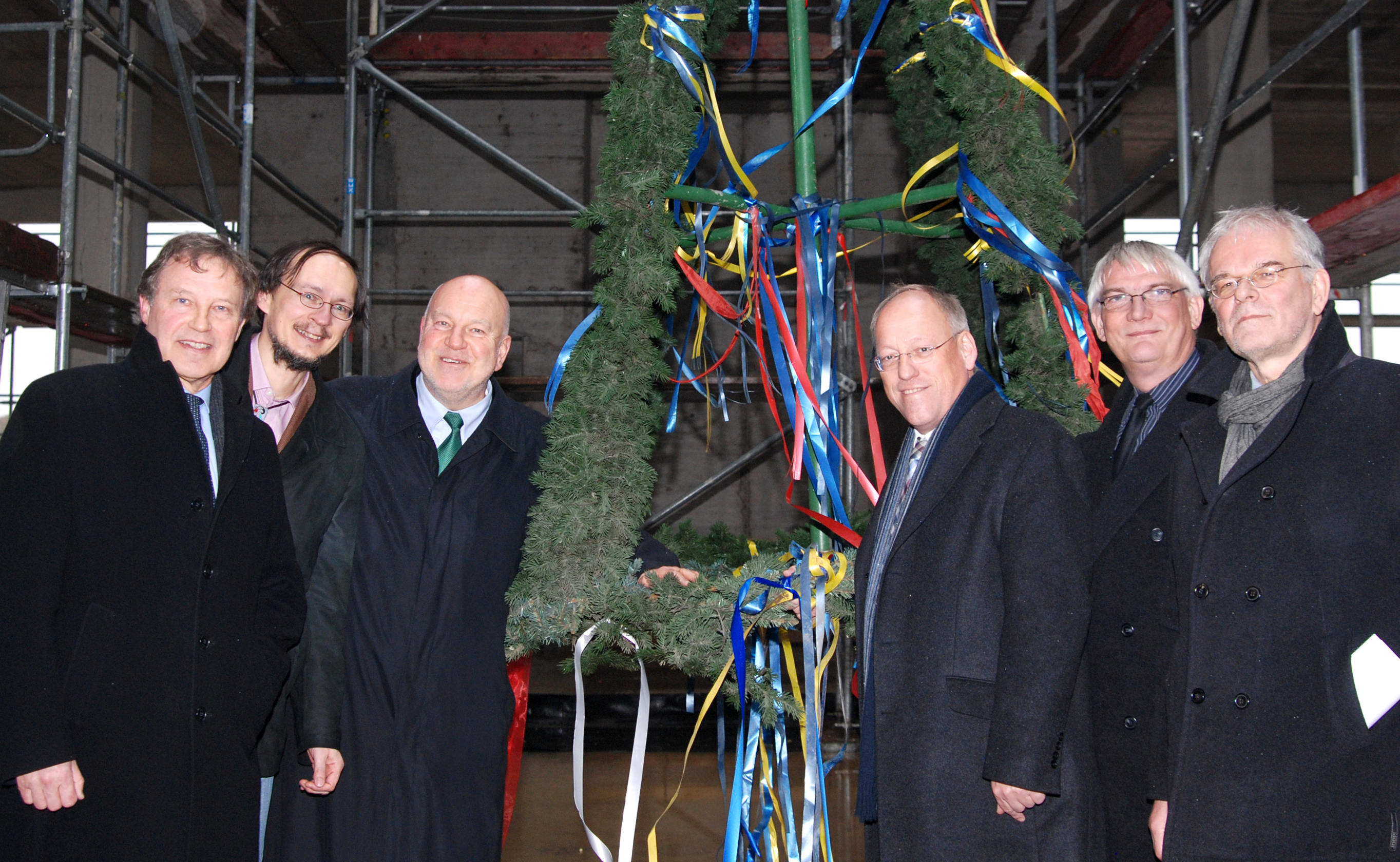 BLB-Niederlassungsleiter Heinrich Micus und der Kanzler der Universität Bielefeld, Hans-Jürgen Simm, begrüßten heute Dr. Uwe Günther (Abteilungsleiter im Ministerium für Wirtschaft, Energie, Bauen, Wohnen und Verkehr des Landes Nordrhein-Westfalen) in Vertretung des Staatssekretärs Dr. Günther Horzetzky, Pit Clausen, Oberbürgermeister der Stadt Bielefeld, BLB-Geschäftsführer Rolf Krähmer sowie zahlreiche weitere Gäste aus Wissenschaft, Politik und Wirtschaft zum Richtfest des Forschungsbau Interaktive Intelligente Systeme (FBIIS). „FBIIS wird ein in jeder Hinsicht zukunftsorientiertes Gebäude, welches auf dem Campus Nord eine architektonisch selbstbewusste und eigenständige Adresse darstellt“, sagte Heinrich Micus und ergänzte: „Es zeigt darüber hinaus heute schon, wie richtig und wichtig die Erschließung des Campus Nord für die weitere Entwicklung der Universität Bielefeld in Zukunft sein wird. Gemeinsam mit den anderen Projekten auf dem Campus realisieren wir hier gerade ein Jahrhundertwerk.“