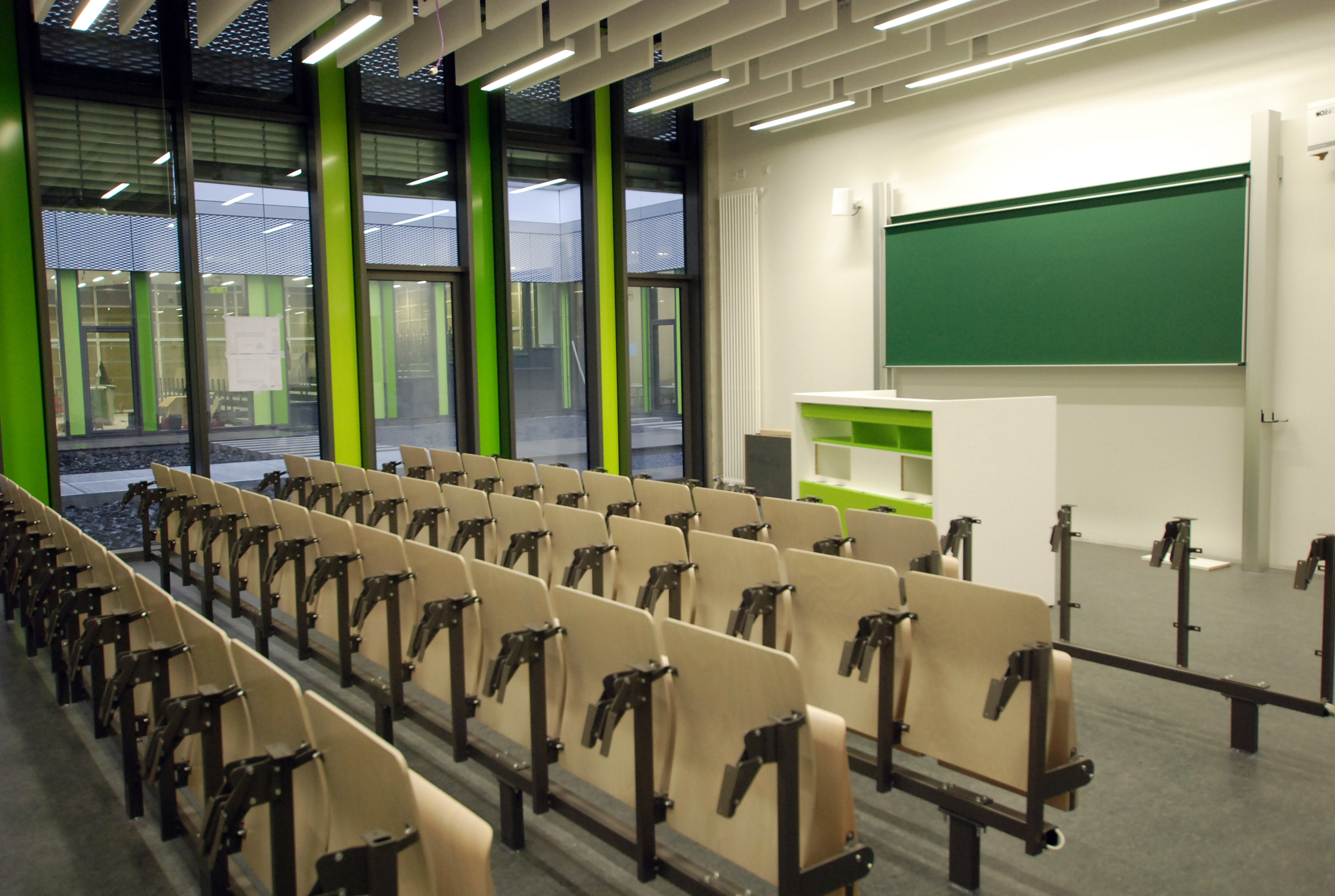 Die modernen Seminarräume und Hörsäle wirken frisch und hell. Der grüne Farbton, der sich auch in der Außenfassade des Gebäudes findet, wird im Inneren in verschiedenen Elementen wieder aufgenommen. Alle Seminarräume und Hörsäle verfügen darüber hinaus über große Fensterfronten. In einigen Hörsälen werden die Klapptische leider erst im Oktober geliefert und eingebaut.