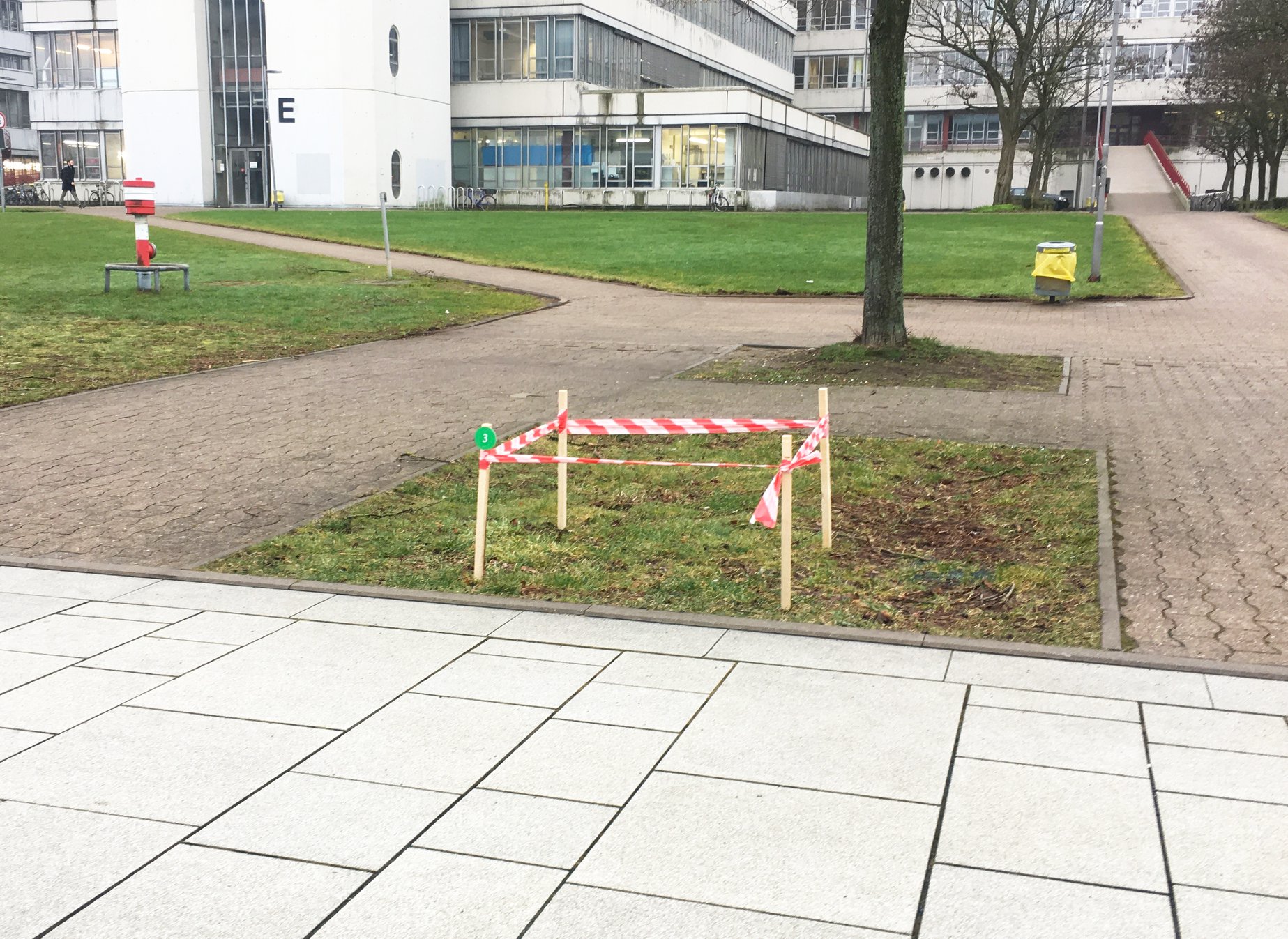 Auf dem Campus verteilt stehen seit einigen Tagen Markierungen (siehe Foto), die kleine Flächen absperren. Hier handelt es sich um Vorbereitungen für ein neues Beschilderungssystem auf dem Campus. An diesen Stellen werden in den kommenden Monaten nach und nach die Schilder aufgestellt. Das System beinhaltet Lagepläne und schildert Wege sowie Gebäude aus.