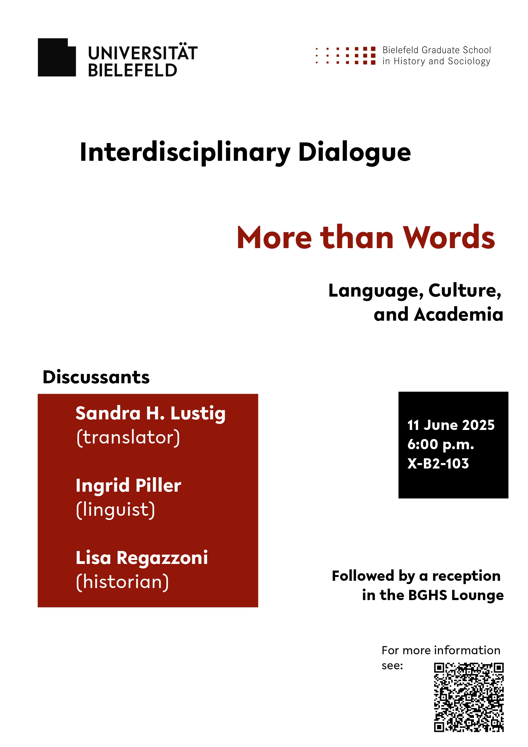 On Wednesday, 11 June 2025 at 6:00 pm, the BGHS will host the 8th Interdisciplinary Dialogue. Entitled "More than Words - Language, Culture, and Academia", the dialogue will focus on the relationship between language and culture in different academic contexts. The event will take place in room X-B2-103. The discussants are: