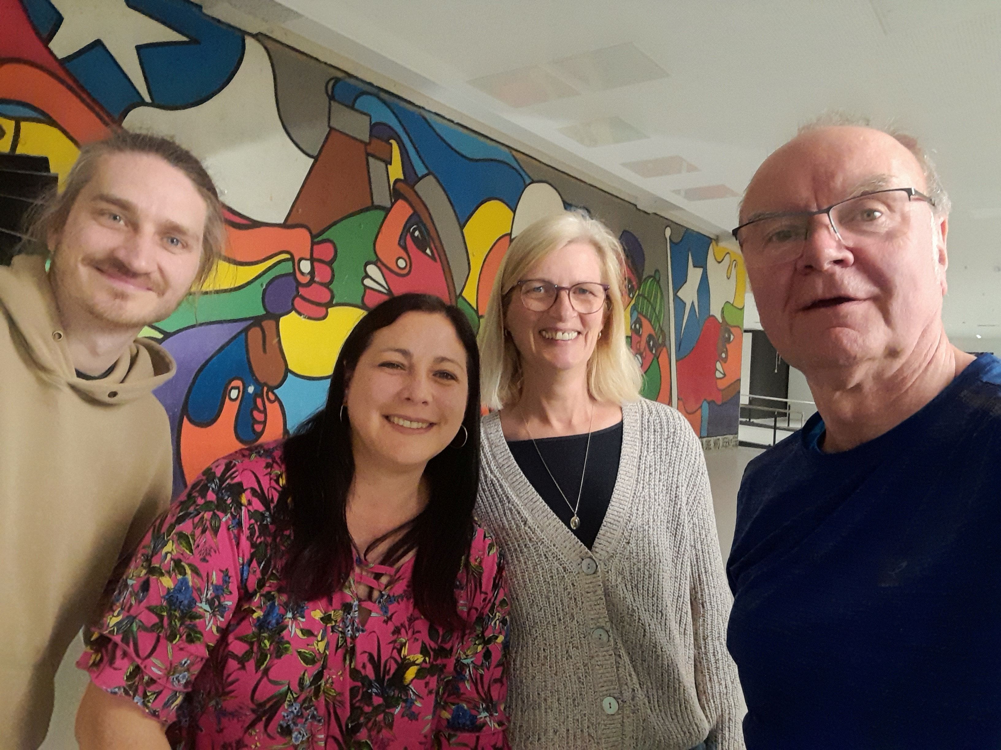Lorena Albornoz and Sabine Schäfer together with Magnus Krenz and Jörg Erber from Filmhaus Bielefeld e.V. in front of the Chile picture at the Audimax (Copyright: Lorena Albornoz)