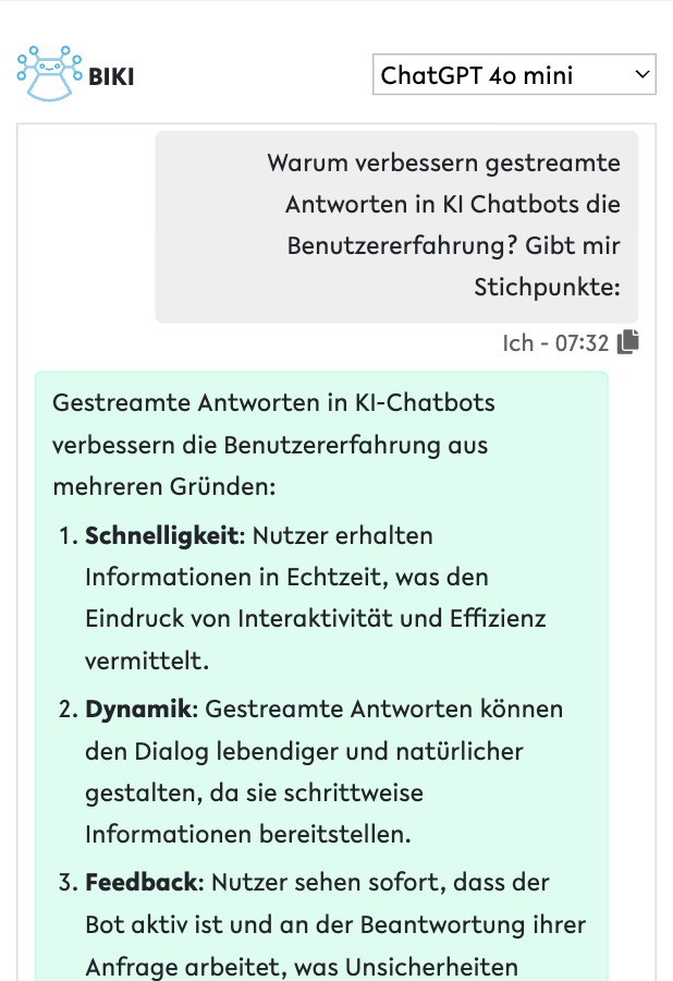 Eine weitere spannende Neuerung ist die Einführung des Streaming-Features in den Einstellungen. Diese Funktion ermöglicht es Ihnen, Antworten von BIKI in Echtzeit zu erhalten. Anstatt auf die vollständige Antwort zu warten, können Sie nun die Informationen direkt während der Eingabe erhalten. In den meisten Fällen werden Antworten auf Ihre Eingaben nun mit nur minimaler Verzögerung beginnen.