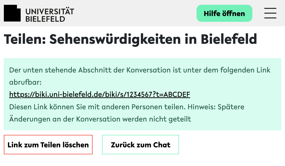 Sie gelangen dann in die Seite, in der Sie das Teilen bestätigen und nachdem Sie dies getan haben wird der Zugriffslink verfügbar, über den andere BIKI Nutzer*innen auf Ihre Konversation zugreifen können: