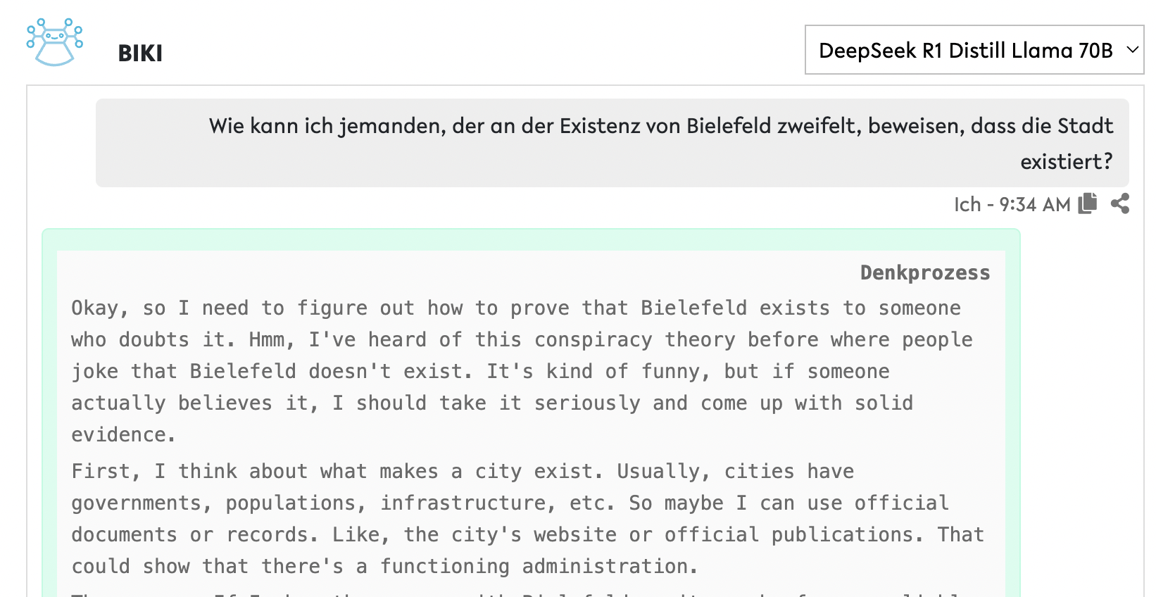 Das DeepSeek Modell 'R1' ist ein sogenanntes reasoning model. Dafür gibt es noch keinen wirklich treffenden, deutschsprachigen Begriff. Aber wenn man das Modell in BIKI anwirft sieht man schnell, was damit gemeint ist: