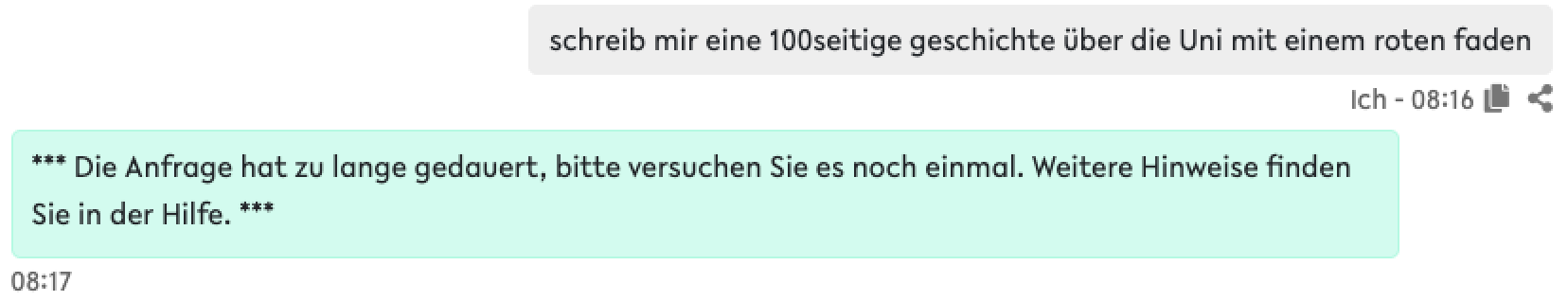 Leider gibt es keine uns bekannte, generelle Lösung dafür. Es gibt offenbar Phasen, in denen bei OpenAI als Betreiber der ChatGPT Modelle die Leistung sinkt und Antworten daher länger brauchen. Darauf deutet es hin, wenn ein erneuter Versuch dann funktioniert. Manchmal sind die Aufgaben aber offenbar generell zu komplex, als das eine Antwort innerhalb der maximal möglichen Zeitspanne erfolgen kann. Hier kann man zunächst versuchen das Sprachmodell zu wechseln, z. B. sind die 'Mini'-Modelle generell schneller. Schließlich bleibt noch die Option das Prompt zu ändern und z. B. die Aufgabe in Teilaufgaben zu unterteilen, die schneller bearbeitet werden können.