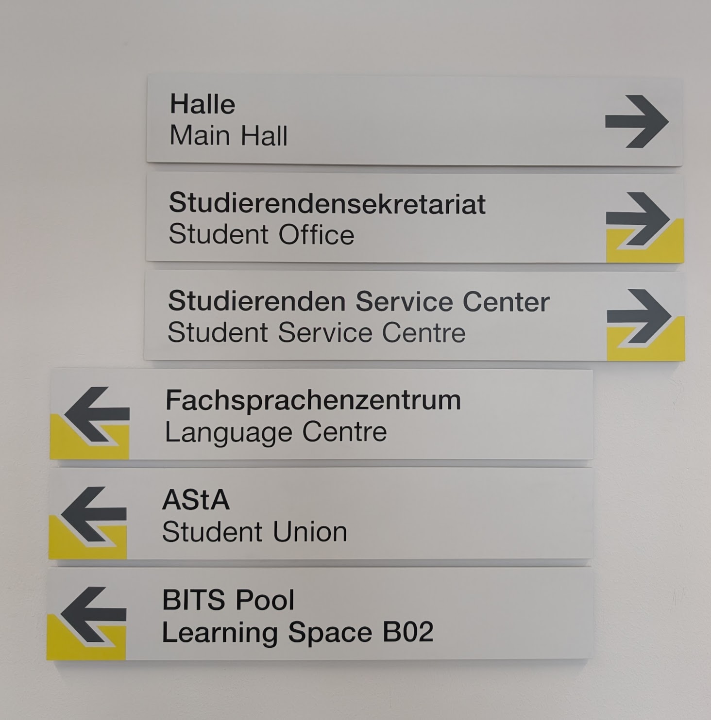 Jedes Schild zeigt einen schwarzen Pfeil, der nach rechts oder links weist, wobei die Pfeile ein gelbes Rechteck im unteren Bereich haben. Die Beschriftungen sind in Schwarz auf weißem Hintergrund gehalten, wobei die deutsche Bezeichnung fett gedruckt ist.'