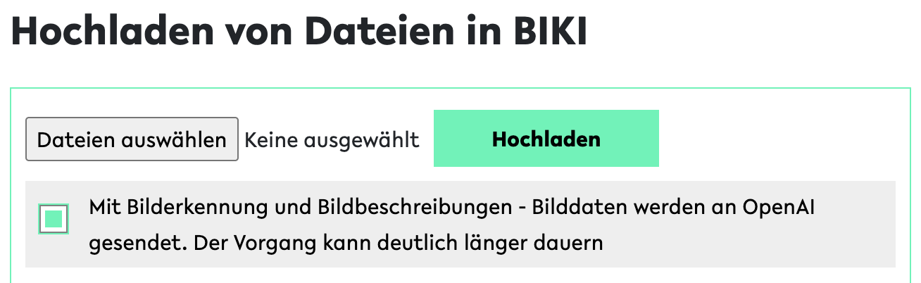 Seit heute hat der Dateiupload eine neue Option, durch die OCR (Optical Character Recognition, optische Zeichenerkennung) bzw. die KI-basierte Generierung von Bildbeschreibungen aktiviert werden kann. Das im Hintergrund arbeitende Konvertierungssystem entscheidet dabei selbstständig, welches Auswertungsverfahren es nutzt. Wenn es entscheidet, dass eine KI für die Bildinterpretation verwendet werden soll, so wird die Datei heute mit einem Sprachmodell von OpenAI verarbeitet. Generelle Hinweise zu OpenAI finden Sie in unserer Seite mit den Sprachmodellbeschreibungen.