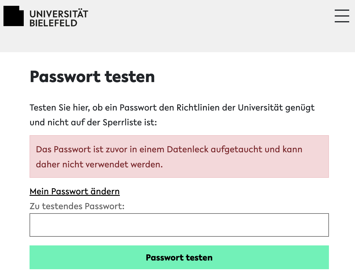 Zusätzlich findet eine Überprüfung statt, ob Ihr Passwort auf einer Liste von gestohlenen Passworten steht. Die Datenquelle ist hier der have i been pwned (HIBP) Dienst. Die Prüfung der Passworte erfolgt dabei in sicherer Weise innerhalb unserer IT-Systeme, es werden keine Daten an externe Dienste übertragen. Wenn sich ein Passwort in dieser Liste befindet, so kann es nicht verwendet werden: