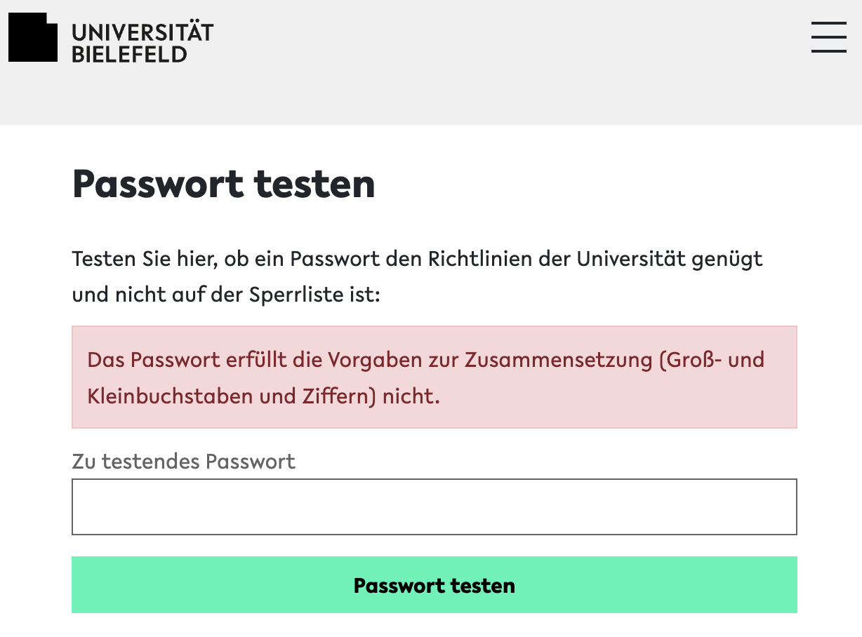 Auf dem Weg zur Verbesserung der Loginssicherheit an der Universität Bielefeld steht der nächste Meilenstein bevor: Ab dem 14. August 2024 wird beim Login in die BIS Anwendungen (eKVV, PEVZ, ..), im Bewerbungs- und Statusportal und den Lernräumen geprüft, ob das Passwort den Sicherheitsrichtlinien (siehe unten) der Universität genügt und nicht auf einer Sperrliste steht!