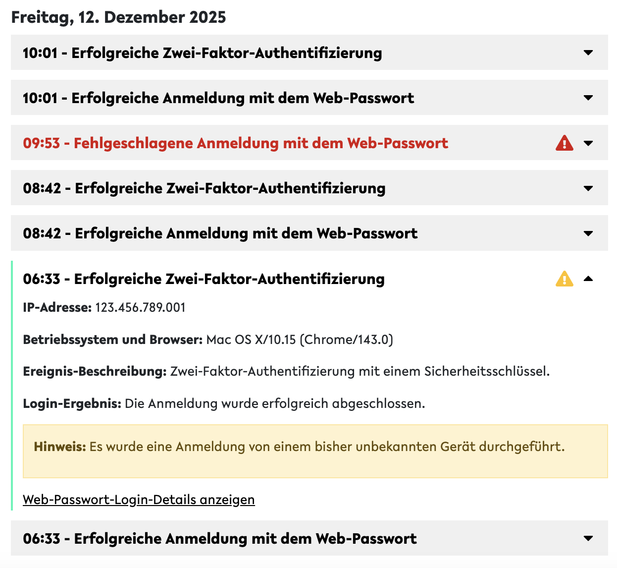So können Sie leichter erkennen, ob es ungewöhnliche oder verdächtige Aktivitäten gab. Wenn Sie zum Beispiel eine Benachrichtigung über ein Login von einem unbekannten Gerät erhalten, finden Sie hier zusätzliche Informationen, um zu prüfen, ob die Anmeldung von Ihnen selbst stammt oder möglicherweise ein Missbrauch vorliegt.