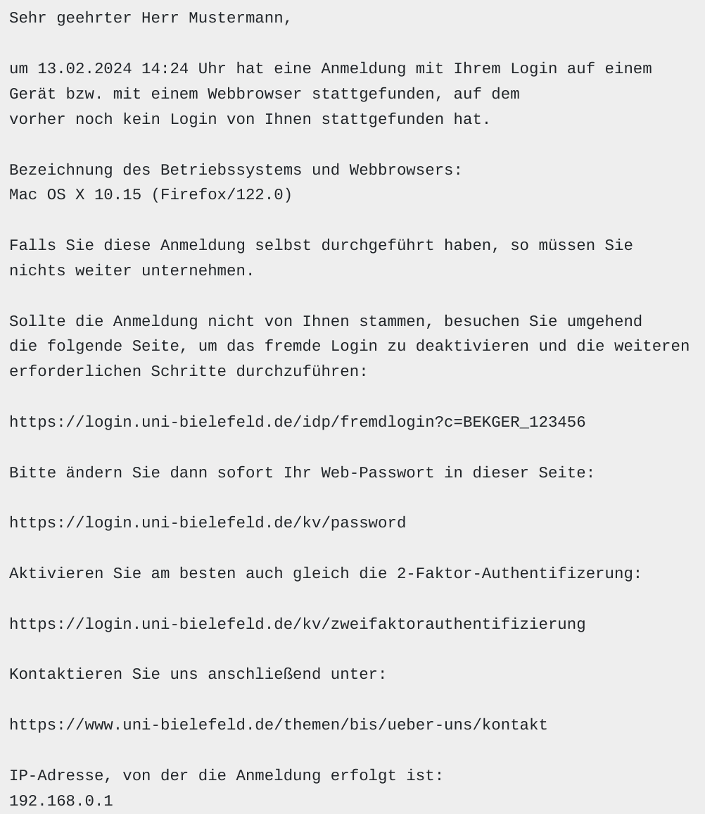 'Sicherheitshinweis: Ein neues Gerät hat sich auf Ihrem Universitätskonto angemeldet'