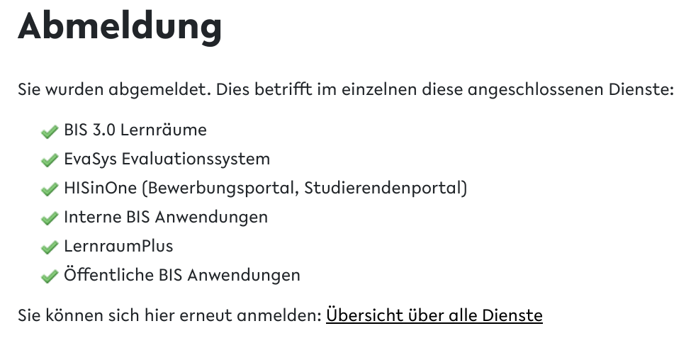 Im Uni Login findet dieses Single Sign-out über die Adresse https://login.uni-bielefeld.de/idp/logout statt, die Seite zeigt Ihnen dann diese Übersicht der Dienste, bei denen Sie abgemeldet wurden: