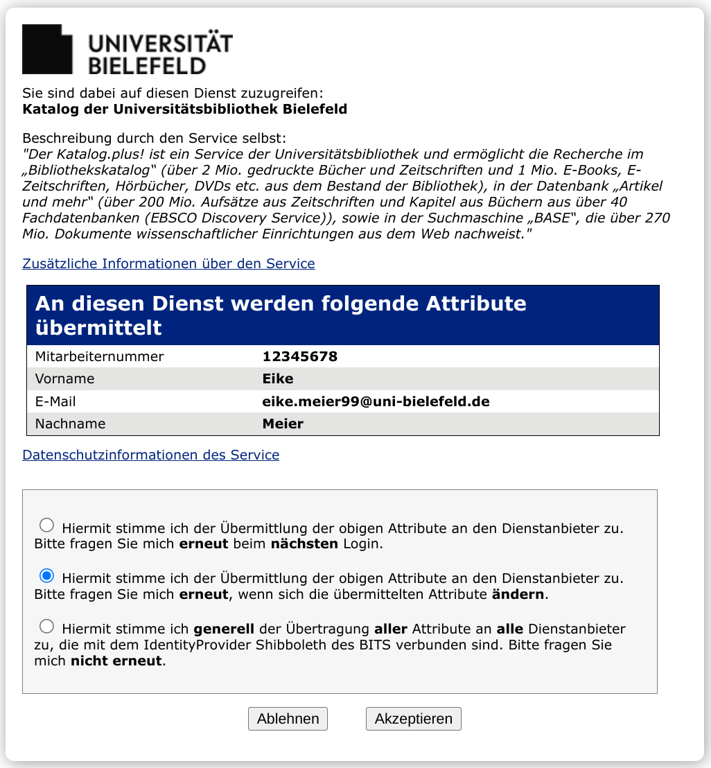 Die bisher beim Login über die Web-Authentifizierung verfügbare Checkbox ‚Attributfreigabe für diesen Dienst wiederrufen‘ wird hingegen zunächst entfallen. Diese Checkbox hat nur den Effekt, dass Sie beim nächsten Login in den entsprechenden Dienst erneut nach der Freigabe gefragt werden. Sie hatte aber nie die Wirkung, dass Ihre bei früheren Nutzungen an den Dienst übertragenen Daten dort auch gelöscht werden. Auch gab es keinen Weg, wie man einen Überblick über alle erteilten Freigaben erhalten und diese ggf. global löschen konnte. In technischer Hinsicht ist es nach jetzigem Stand aber möglich so einen Überblick in der Kontenverwaltung anzubieten. Dies wird zu einem späteren Zeitpunkt erfolgen.
