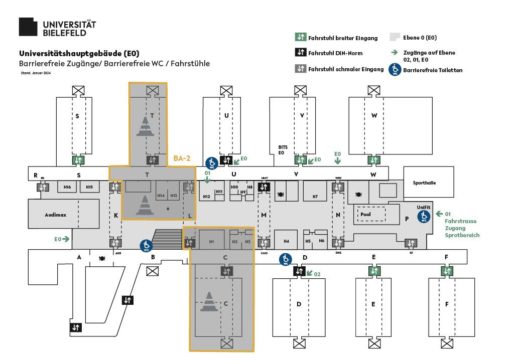 - Es sind die Bauteile T, L und C auf allen Ebenen betroffen, insbesondere Seminarräume, Hörsäle und die zugehörigen Flächen in der Halle.