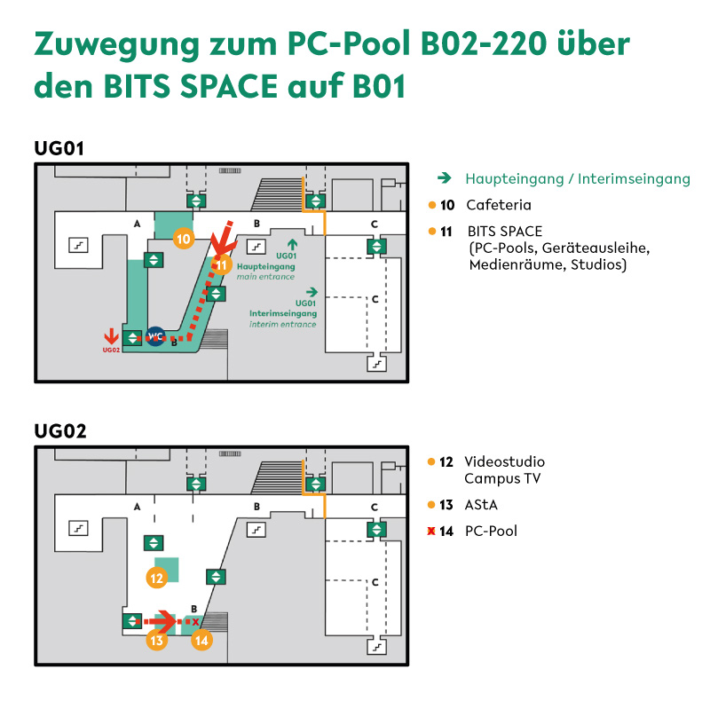 Das BITS hat im Rahmen der Umzüge jetzt einen PC-Pool an einem neuen Ort eröffnet. Der Raum B02-220 befindet sich im neuen Gebäudeteil A/B direkt unter dem BITS SPACE und bietet 34 PC-Arbeitsplätze. Hier kommen Tische und Stühle aus den bisherigen PC-Pools wieder zum Einsatz und auch die Rechner wurden aufbereitet. Die Softwareausstattung ist identisch zu den anderen PC-Räumen des BITS. Von hier aus kann auch der Druckservice studiprint genutzt werden. Ausdrucke sind an den Druckern in B01-005 oder der Bibliothek abholbar. Im Gegensatz zum alten Standort in V0 gibt es nun Tageslicht durch die großen Fensterfronten.