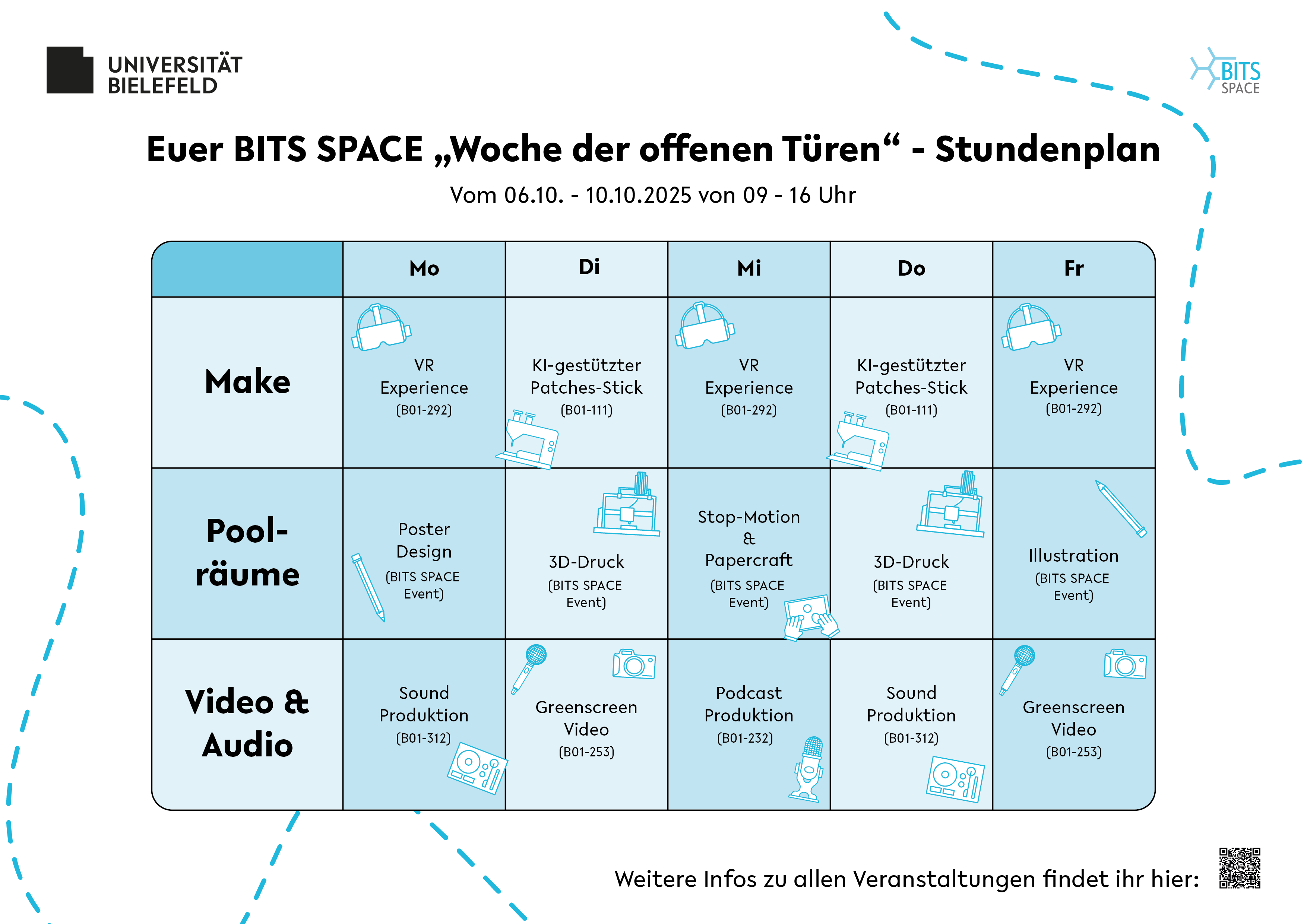 In der Woche vom 06. bis zum 10. Oktober 2025 öffnen wir täglich von 09:00 bis 16:00 Uhr die Türen zu unseren Medienräumen und Studios im BITS SPACE (B01). Dort können Studierende die vielfältigen Möglichkeiten entdeckt werden, wie kreative und innovative Medienarbeit das Studium bereichern kann.