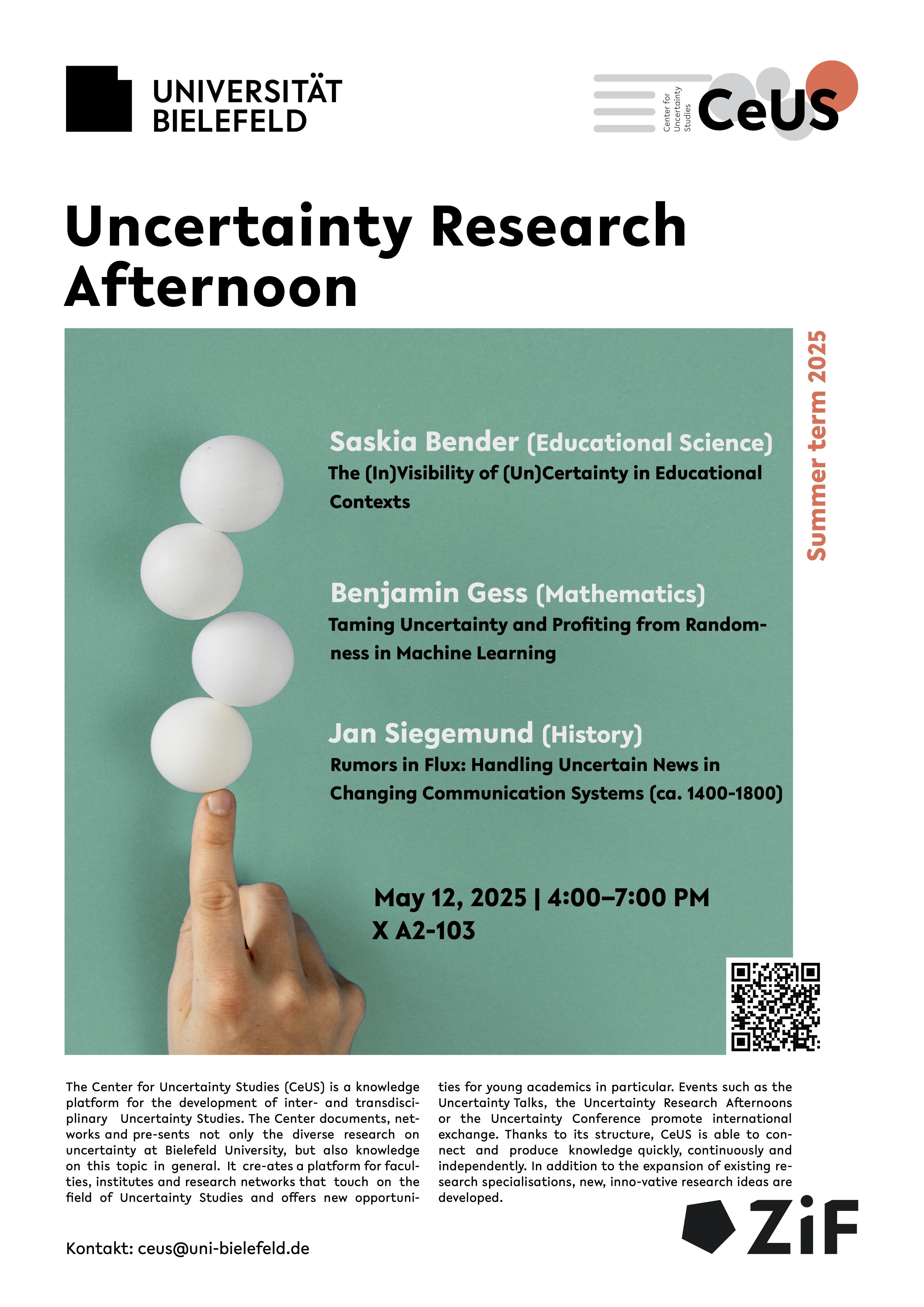 On May 12, 2025, the Center for Uncertainty Studies (CeUS) at Bielefeld University held its fifth Uncertainty Research Afternoon, continuing its tradition of interdisciplinary scholarly exchange. The event, available both in-person and online, brought together researchers to examine uncertainty across different academic fields. The afternoon featured three presentations that explored uncertainty through educational science, mathematics, and historical analysis.