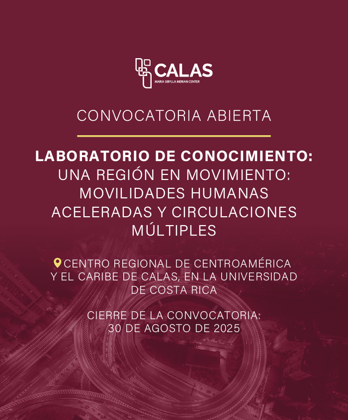 In the framework of the Knowledge Laboratory "A region on the move: Accelerated human mobilities and multiple circulations in Latin America and the Caribbean", the Centre for Advanced Latin American Studies (CALAS) opens the call for up to 5 research fellowships of three to five months duration, to be held between January and July 2026, located in one of the four CALAS regional sites in Latin America, namely Guadalajara (Mexico), San José (Costa Rica), Quito (Ecuador) or Buenos Aires (Argentina). The Laboratory focuses mainly on the contemporary history and present sitution in Latin America and the Caribbean and research can be approached from various disciplines of the Social Sciences and Humanities, as well as from signifying practices, including art, literature, film and television, or social networking services in the space of intermediality; moreover, the circulation of knowledge is also linked to science and technology.