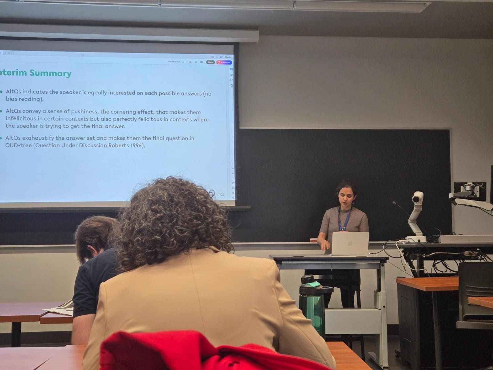 Although AltQs have received considerable attention in the literature, the various forms of AltQs in Farsi remain largely overlooked. In her presentation, she proposed a pragmatic analysis of different types of AltQs in Farsi, suggesting that (semantic) exhaustivity may explain some but not all forms.Cross-linguistic comparisons can highlight subtle distinctions that can lead to novel strategies for encoding (almost) similar meanings. These differences reveal the creativity and flexibility of human language in achieving the same communicative goals.