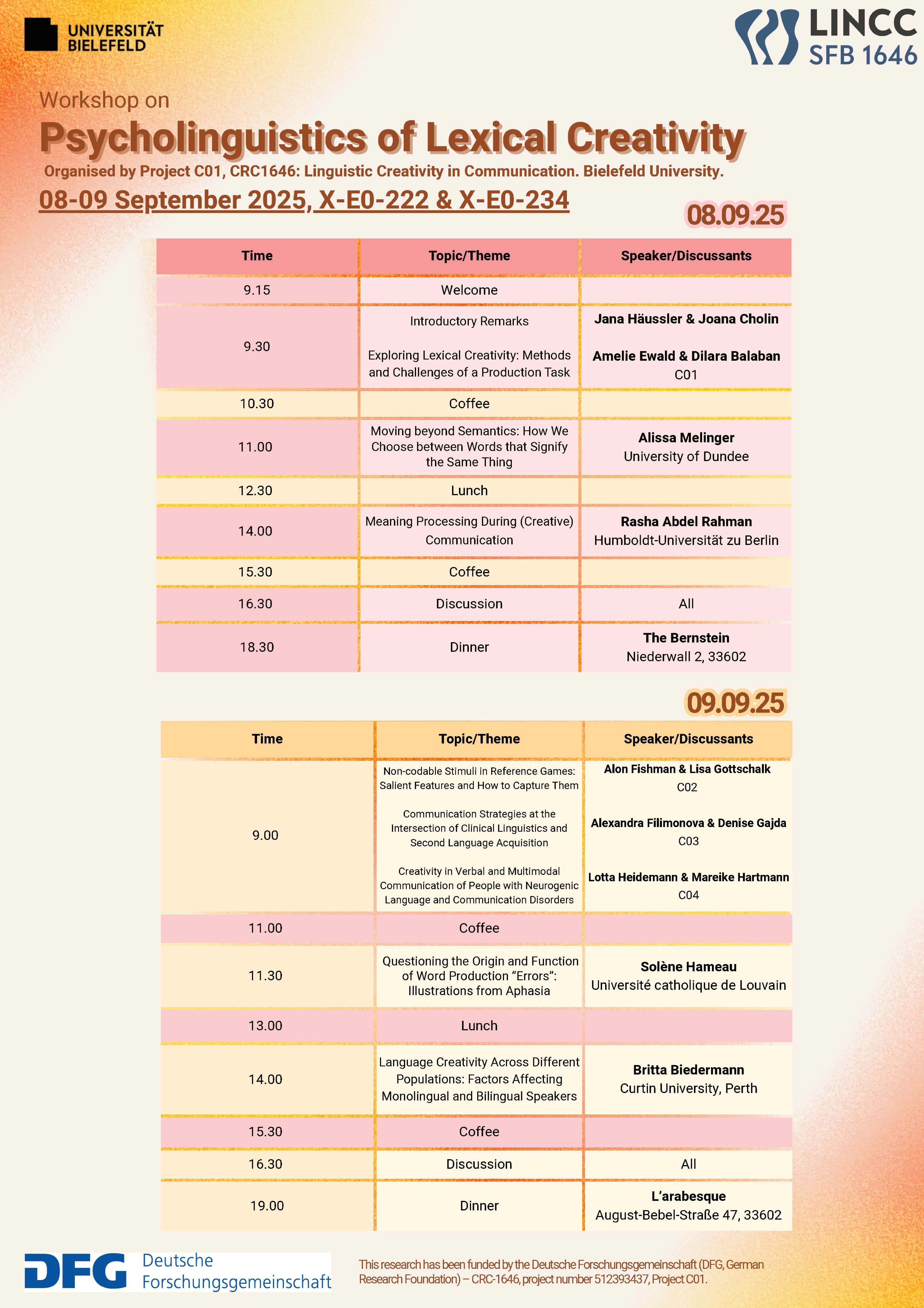 The PhD students and researchers working within the C-Area of the CRC (see below) complemented the keynote talks with the presentations on their ongoing work. The sessions were followed by lively discussions that encouraged the exchange of ideas and highlighted opportunities for future collaboration. The workshop offered an engaging platform for reflecting on how linguistic creativity emerges in different speaker groups and contexts. It provided valuable insights into the cognitive processes and resources that allow speakers to deviate from conventional language use, whether to be inventive, humorous, or to communicate effectively when concepts and words are not available or seem inadequate.