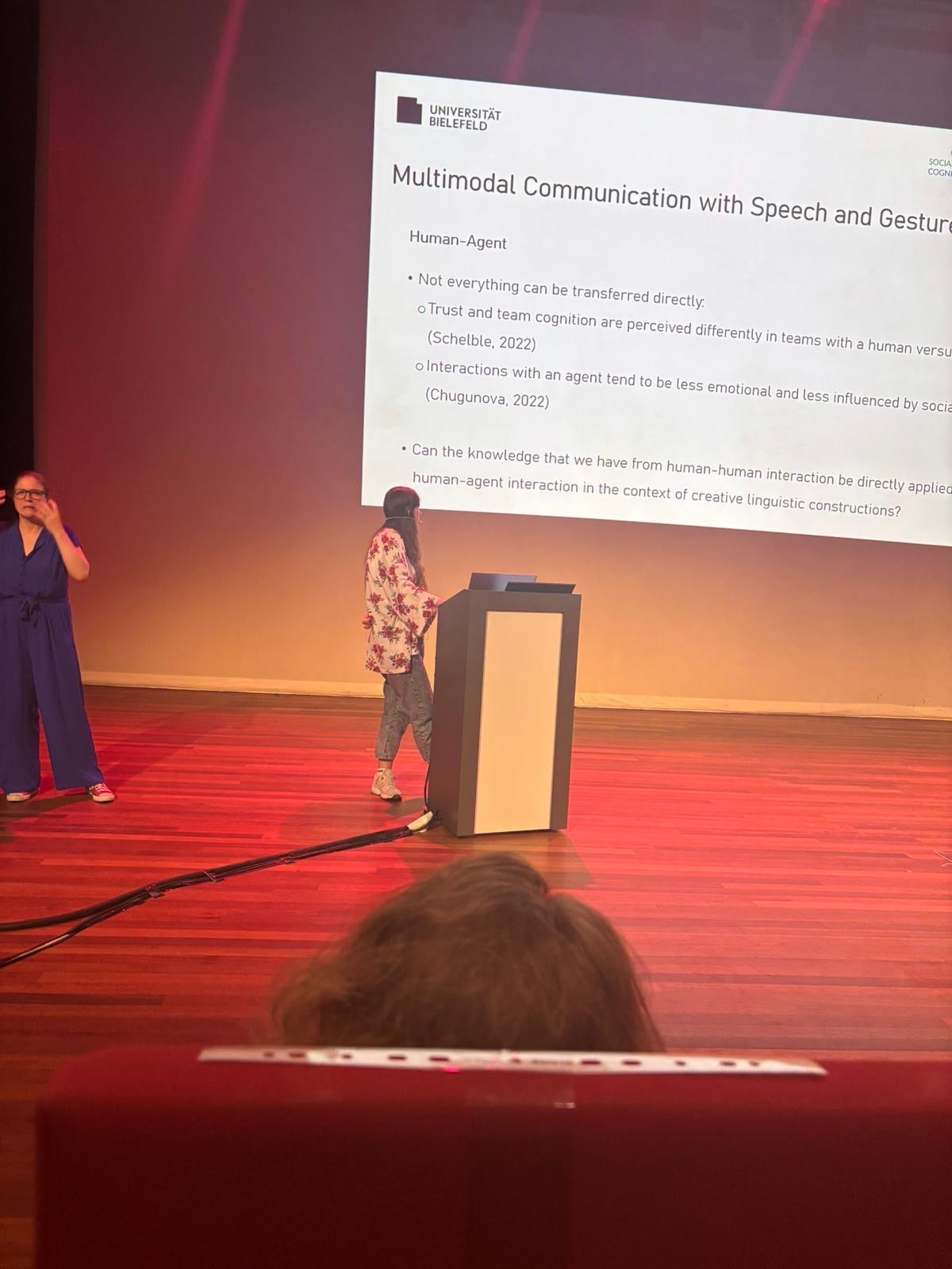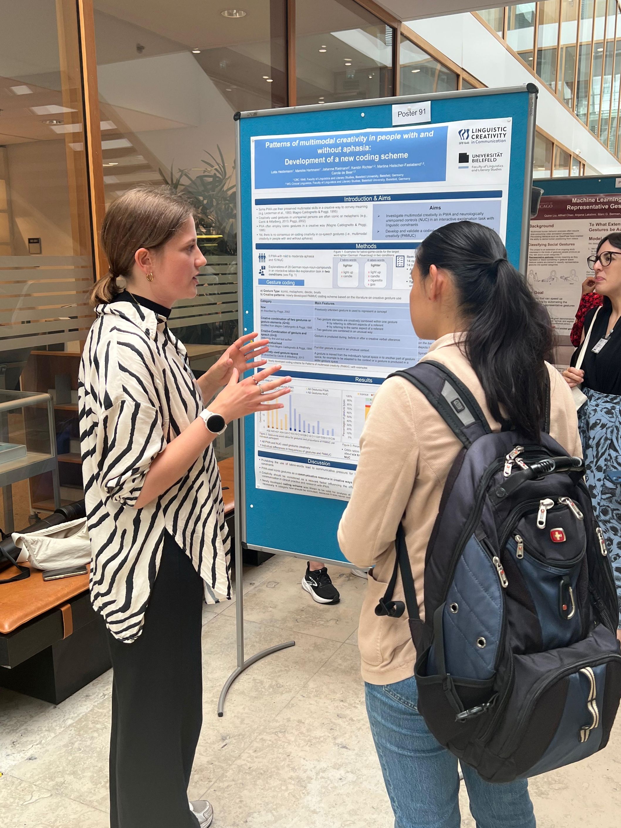 Project C02 presented its research in two talks: Under the title “Co-speech Gestures Accompanying Linguistic Inventions”, Alon Fishman spoke in the session on semiotics. Afterwards, he received valuable suggestions on how to proceed with annotating and analysing of the collected multimodal data. Alon was also approached by colleagues who are currently conducting, or are planning to conduct in the future, studies on different research questions using similar methodologies. These discussions yielded a fruitful exchange of ideas and could potentially lead to collaborations, exploring how different experimental manipulations influence gesture use in multimodal interaction. The second talk was given by Lisa Gottschalk with the title “The Impact of Gestures on the Perception of Creative Linguistic Constructions by Humans and Virtual Agents” during the session focused on Machine Learning, AI, and Virtual Reality. She presented the contributions from the computer science component of the project, emphasizing the role of the perception of linguistic inventions in enhancing the modeling of co-speech gestures and their integration within AI-driven multimodal agents. Attendees demonstrated great interest in the work of C02, providing constructive suggestions for extending this analysis to languages beyond German. This exploration may yield insights into linguistic variations and speaker-agent alignment, potentially fostering collaborations with other researchers in the field. The third contribution was the poster presentation entitled “Patterns of multimodal creativity in people with and without aphasia: Development of a new coding scheme“, given by Lotta Heidemann. She discussed her coding scheme for patterns of multimodal creativity in people with and without aphasia which was newly developed during a pilot study for the project C03. In exchange with interested colleagues Lotta received precious suggestions on how to further develop the coding scheme and the field of gesture research in people with aphasia. This discussion with other gesture researchers resulted in a valuable exchange of ideas and may continue beyond the conference.