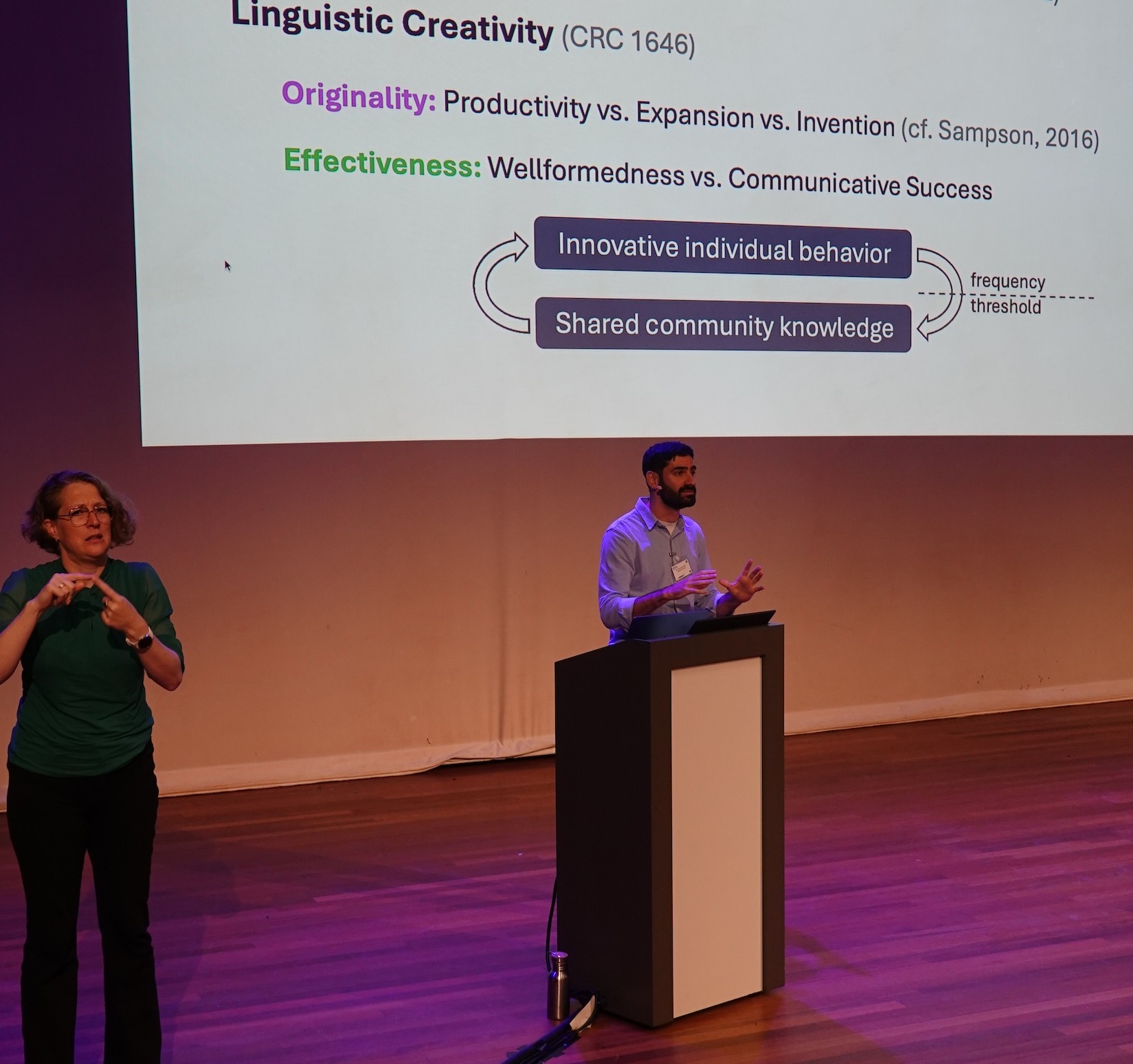 The conference took place over three days, with most of the program devoted to talks in parallel sessions organized by topic, in addition to five keynote presentations and three poster sessions. Many of the talks were interpreted in real time from English to International Sign or vice versa, to facilitate participation by deaf researchers. One of the highlights of the conference was a keynote presentation by Professor Johanna Mesch, given in International Sign, about deafblind communication. She explained how deafblind sign language speaker use both sign language as well as nonconventional expressive gestures in tactile modalities, such as touching each other’s hands, to adapt to nonvisual communication.