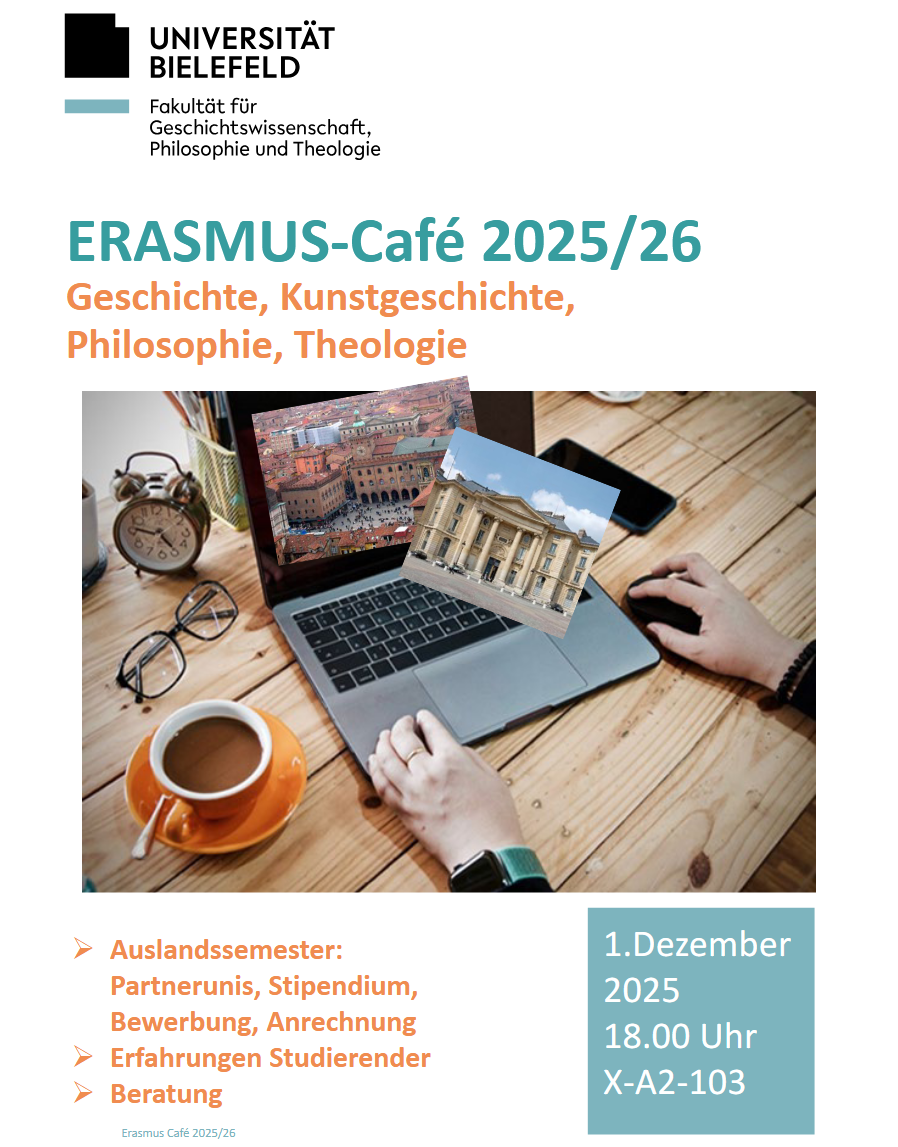 Studierende (BA/MA, fachwissenschaftlich, Lehramt) und Promovierende sind herzlich zum Erasmus-Café der Fakultät für Geschichtswissenschaft, Philosophie und Theologie am 1. Dezember 2025 von 18:00 bis 20:00 Uhr in X A2-103 eingeladen. Haben Sie Interesse, internationale Studienerfahrungen in einem gut koordinierten Rahmen und mit finanzieller Unterstützung zu sammeln? Dies ermöglicht Ihnen ein Erasmus+ Mobility Grant, mit dem Sie Geschichte, Kunstgeschichte, Philosophie oder Theologie für ein oder zwei Semester an einer unserer Partneruniversitäten studieren und die im Ausland erbrachten Studienleistungen in Ihrem Bielefelder Studienprogramm anrechnen lassen können. Auslands-BAföG, Social Top Ups und Green Travel-Zuschüsse ergänzen die Förderung. Sie erhalten Informationen des International Office zu Erasmus+ Mobility, lernen von den Erfahrungen ehemaliger Erasmus-Studierender und erfahren alles Wissenswerte über Partneruniversitäten, Bewerbung, Förderung und Anrechnung von Studienleistungen.