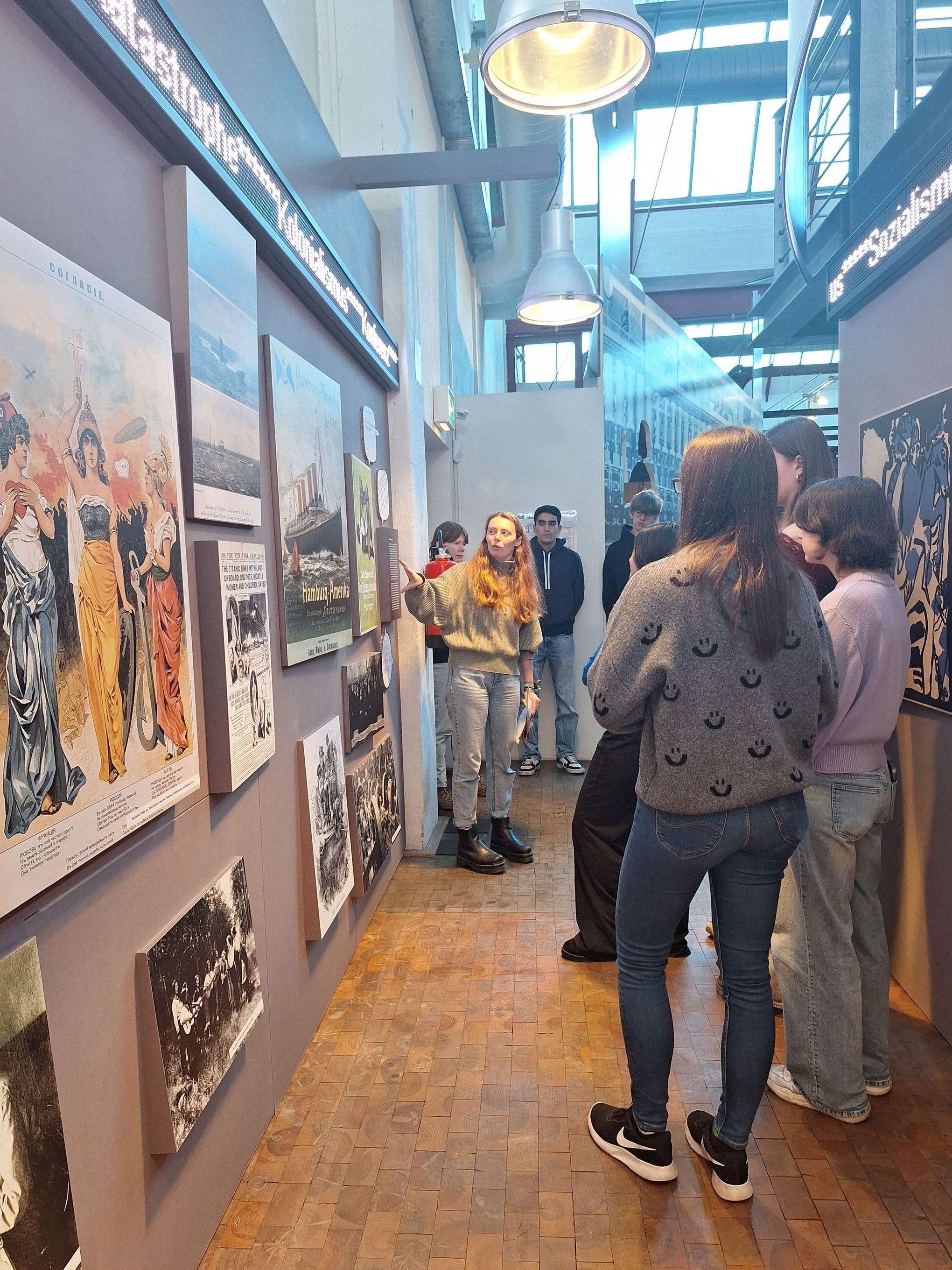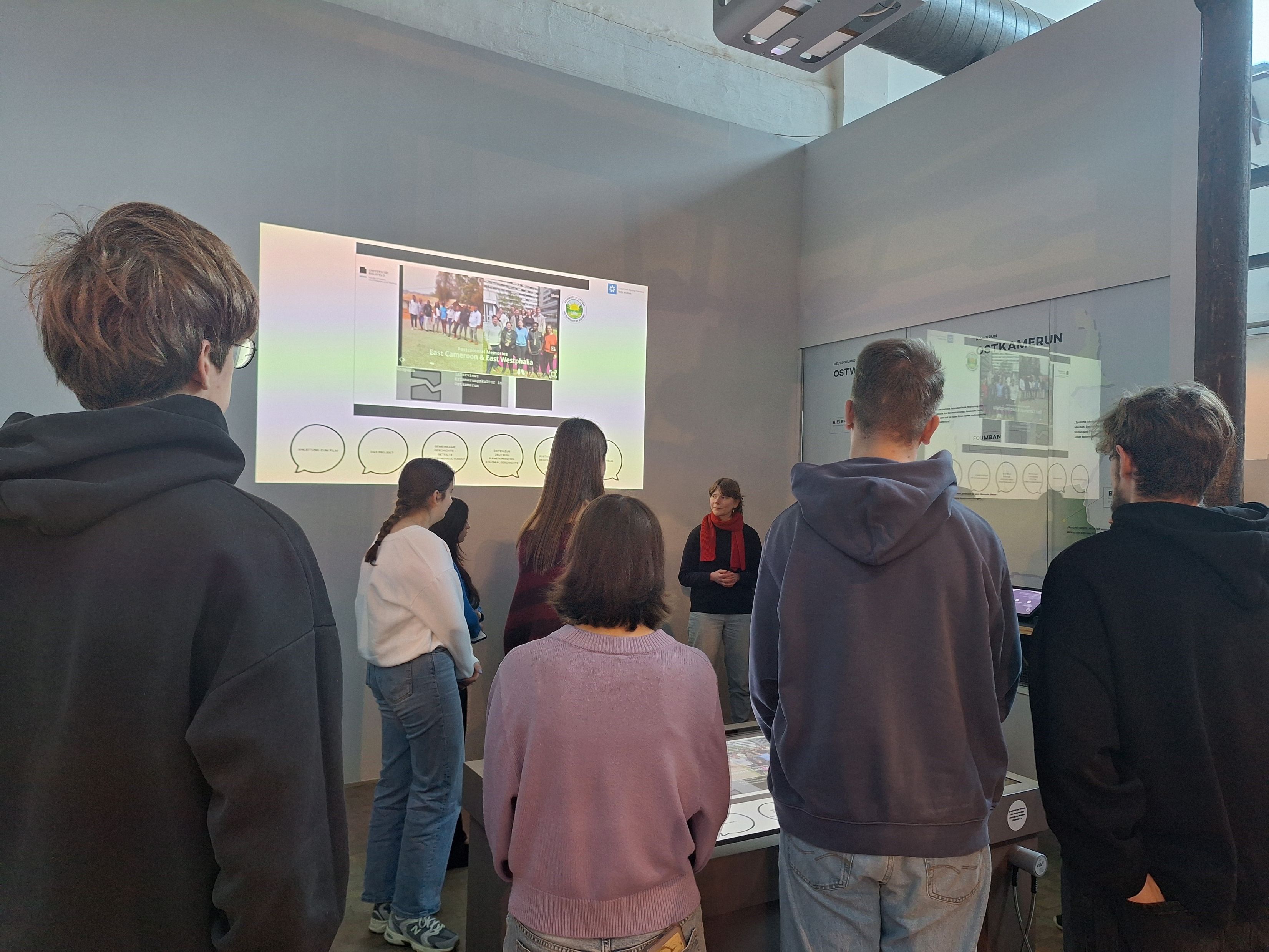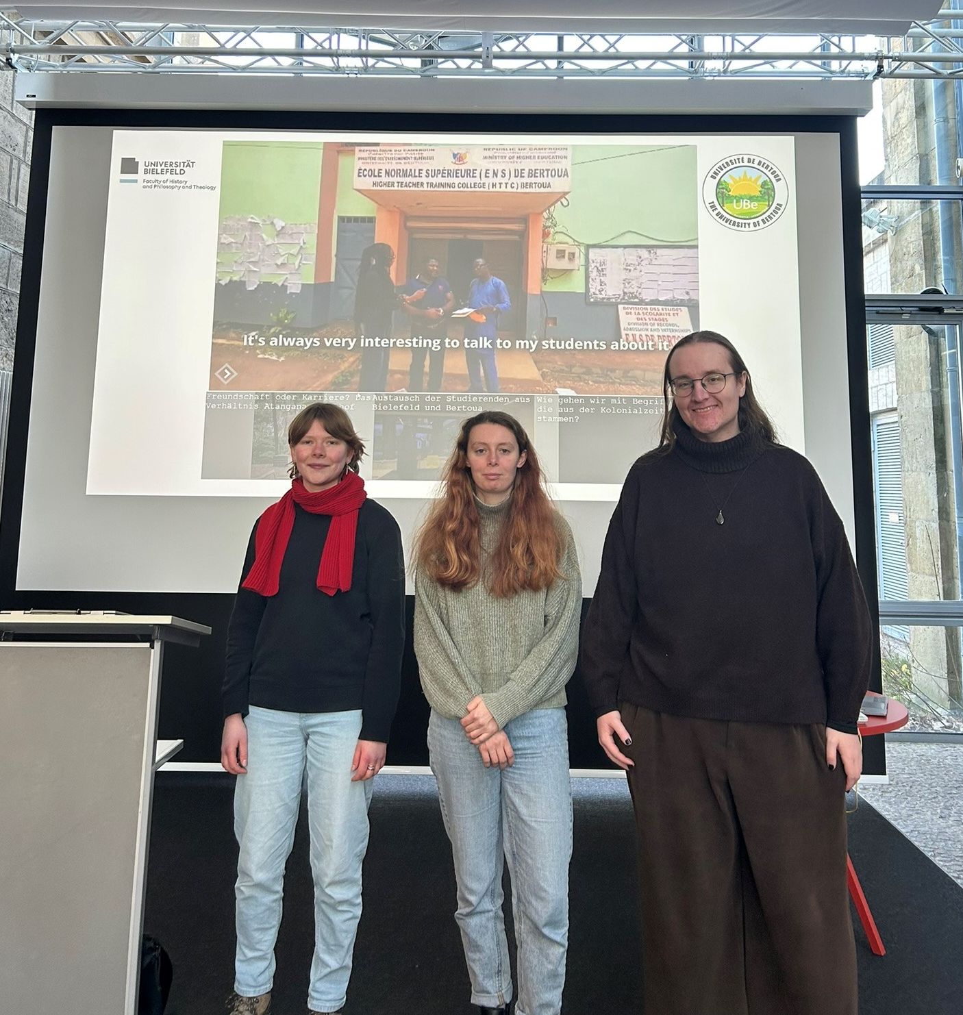 Am 20. Januar 2026 führten Lola Marie Wienberg, Viola von Lochow und Jonas Köllinger, Studierende aus dem Projektseminar „Postkoloniale Erinnerungen zwischen Deutschland und Kamerun / Ostwestfalen und Ostkamerun“, das im Wintersemester 2024/25 und im Sommersemester 2025 stattfand, einen Workshop mit Schüler*innen des Städtischen Gymnasiums Gütersloh im Historischen Museum Bielefeld durch. Teilgenommen haben Schülerinnen und Schüler zweier Geschichts-Leistungskurse, die in dem Workshop einen praxisnahen Einblick in das Geschichtsstudium erhielten. Sie erfuhren, wie die Studierenden, angefangen mit der Recherche, Themen der regionalen Kolonialgeschichte erforscht und in einem Film und eine Ausstellungsintervention übersetzt haben.