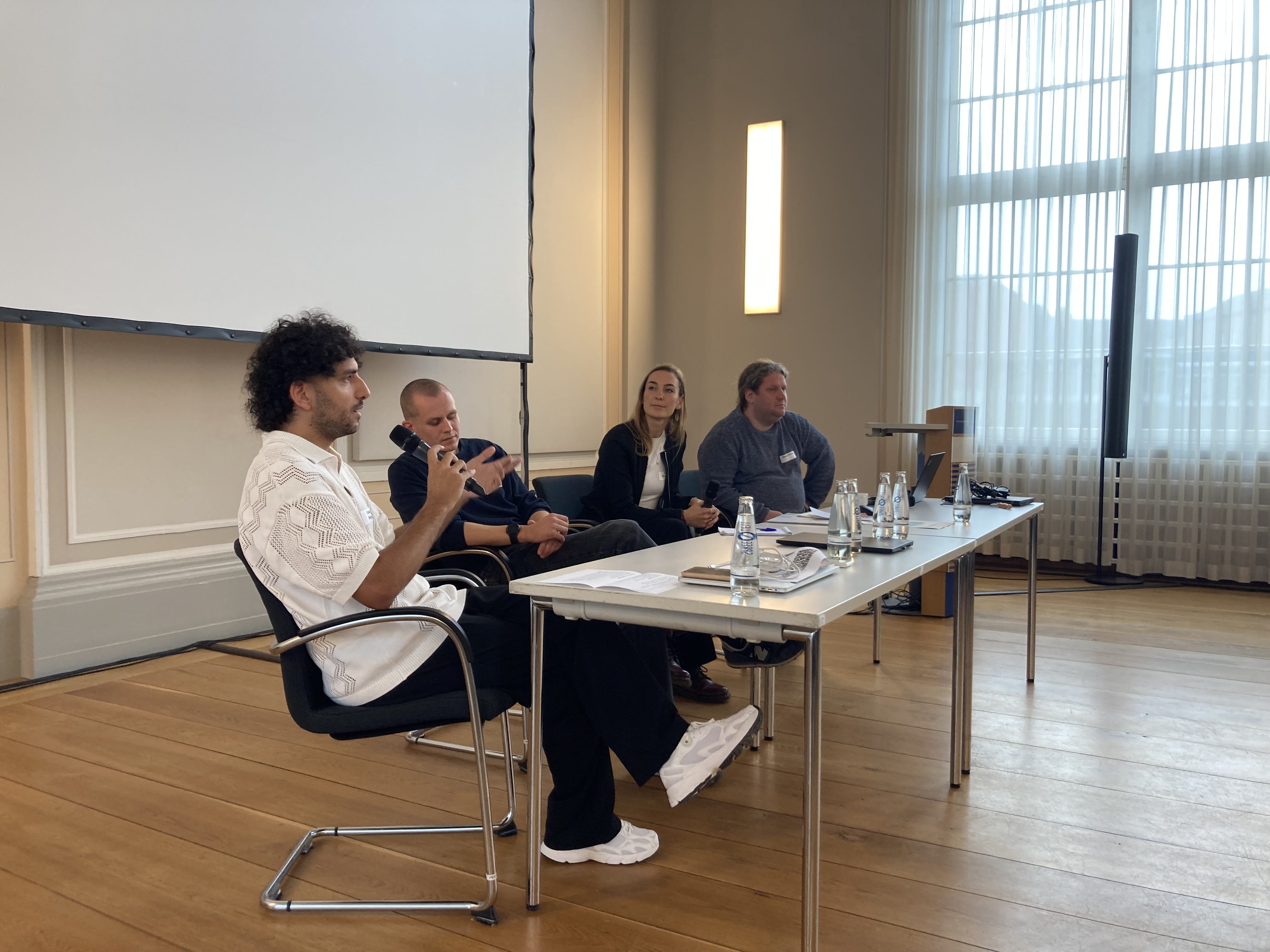 Am Nachmittag fanden zwei Paneldiskussionen statt: Die erste konzentrierte sich auf den Austausch über zivilgesellschaftliche Initiativen, während bei der zweiten wissenschaftliche Forschungsarbeiten präsentiert und diskutiert wurden. Unter dem Titel „Einblicke in die Initiativarbeit zivilgesellschaftlicher Akteur:innen“ moderierten Judith Bergkemper und Daniel Kubiak das Panel, in dem zwei zivilgesellschaftliche Projekte ihre Arbeit vorstellten. Hamidou Bouguerra von DaMOst e.V. hob insbesondere die Bedeutung communitybasierter Beratung gegen Rassismus sowie die Rolle von "Brave Spaces" hervor. Danach thematisierte Johann Hennigsen vom Dokumentationszentrum „Lichtenhagen im Gedächtnis“ die Erinnerung und gesellschaftliche Aufarbeitung des rassistischen Pogroms in Rostock-Lichtenhagen. In der anschließenden Diskussion wurden verschiedenste Fragen zu den Gestaltungsmöglichkeiten, lokalen Gegebenheiten und Herausforderungen vor Ort aufgeworfen. Im zweiten Panel, moderiert von Emma Luna Brahm und Mert Pekşen, wurden wissenschaftliche Perspektiven auf den Zusammenhang zwischen Raum und Migration und der Bedeutung solidarischer Infrastrukturen präsentiert. Leoni J. Keskinkılıç stellte Teilergebnisse des Projekts „StadtUmMig II“ vor, das sich mit dem Wandel sozialer Infrastrukturen in neuen migrantischen Nachbarschaften in Schwerin, Halle (Saale) und Cottbus beschäftigt. Zudem teilte Çağrı Kahveci einen Input zu den Diskursen um die Erinnerung an rassistisch motivierte Gewalttaten und die damit verbundenen Prozesse der (Un-)Sichtbarmachung rassistischer Gewalt sowie Solidarisierung mit betroffenen Akteur:innen, insbesondere in Solingen.