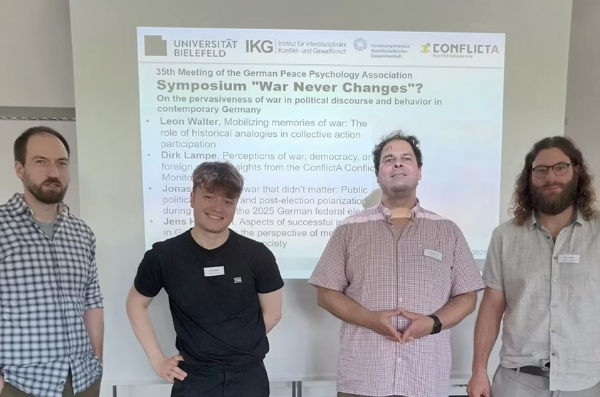 Das Bielefelder Symposium fand statt unter dem Titel „‘War Never Changes‘? On the Pervasiveness of War in Political Discourse and Behavior in Contemporary Germany“ (auf Deutsch etwa „,Krieg ändert sich nie?‘ Zur Allgegenwärtigkeit des Krieges im politischen Diskurs und Verhalten im heutigen Deutschland“). Die insgesamt vier Präsentationen von Leon Walter, Dirk Lampe, Jonas Rees und Jens Hellmann bezogen sich auf Effekte von Erinnerungen an Krieg, ausgewählte Ergebnisse des Konfliktmonitors bezogen auf Krieg und Außenpolitik, gesellschaftliche Polarisierungen nach der Bundestagswahl 2025 und Sichtweisen auf die Integration Geflüchteter.