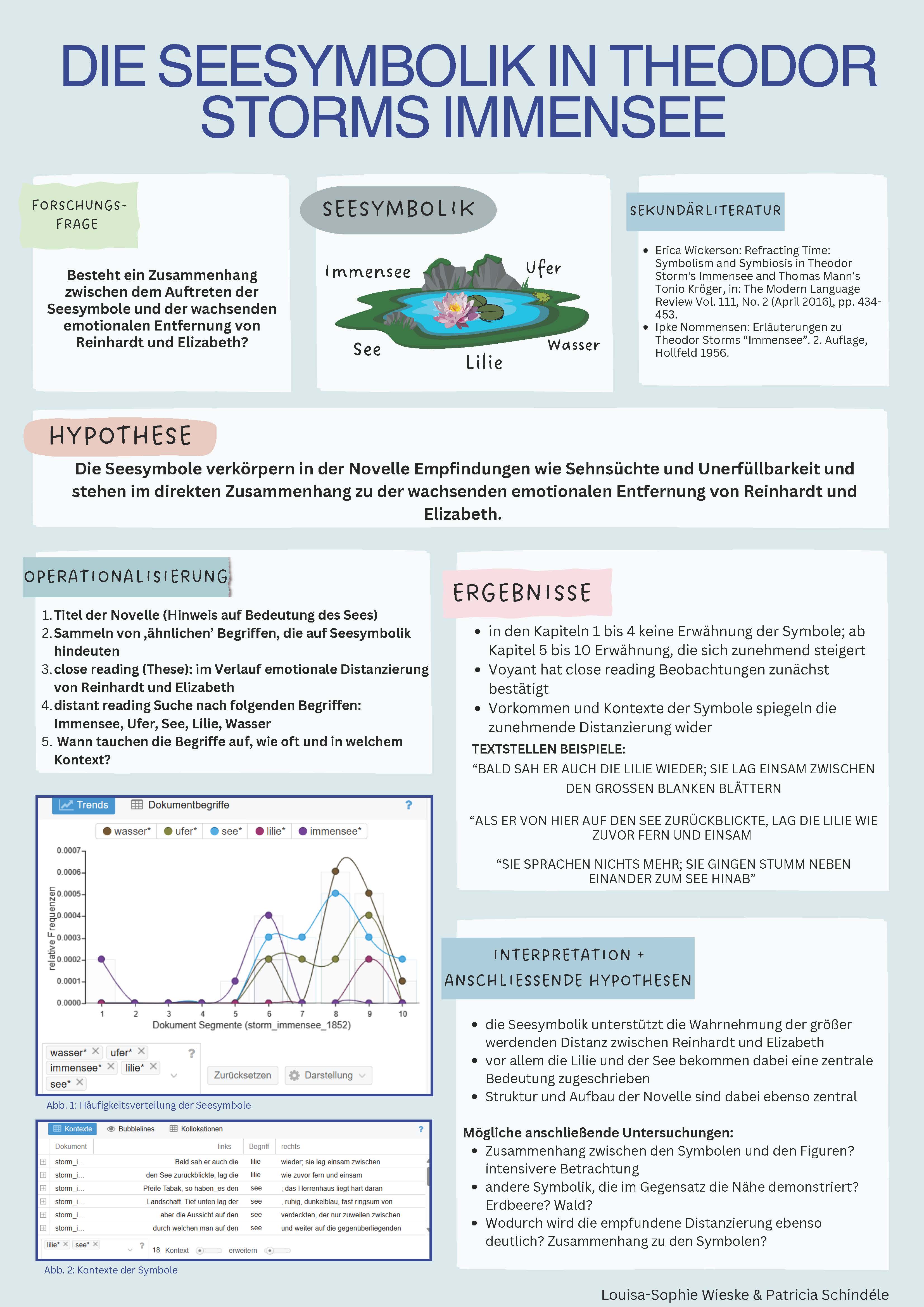 Für die meisten von uns Studierenden waren die Digital Humanities etwas, mit dem wir bisher kaum oder gar nicht in Berührung gekommen sind. Es war spannend zu erfahren, welche Untersuchungsmöglichkeiten die Tools bieten, die vorher nicht möglich waren, wie Fragestellungen des Close Readings so operationalisiert werden konnten, dass sie für Voyant fruchtbar wurden und wie beide gemeinsam beeindruckend differenzierte und umfangreiche Analyseergebnisse hervorbringen konnten. Dies fand seinen Höhepunkt in den in Partner*innenarbeit erarbeiteten Postern, die das Ergebnis einer solchen Untersuchung und Analyse unterschiedlicher literarischer Werke des Realismus und Naturalismus waren und in einer Art Museumsrundgang im Seminar gemeinsam betrachtet und besprochen werden konnten.