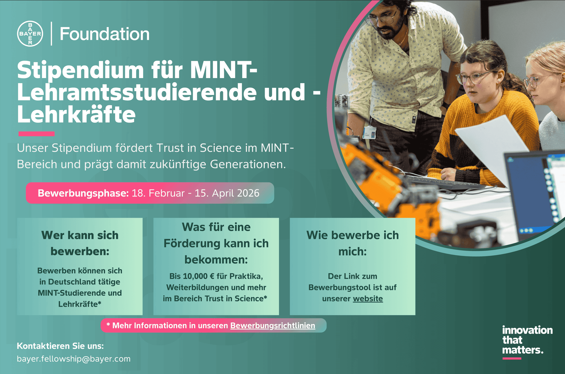 Wie entsteht eigentlich Vertrauen in Wissenschaft? Und wie kann man genau das im Unterricht vermitteln? Genau hier setzt ein spannendes Förderprogramm der Bayer Foundation an: Ein Stipendium speziell für MINT-Lehramtsstudierende und Lehrkräfte, die „Trust in Science“ aktiv in ihre Bildungsarbeit integrieren möchten.