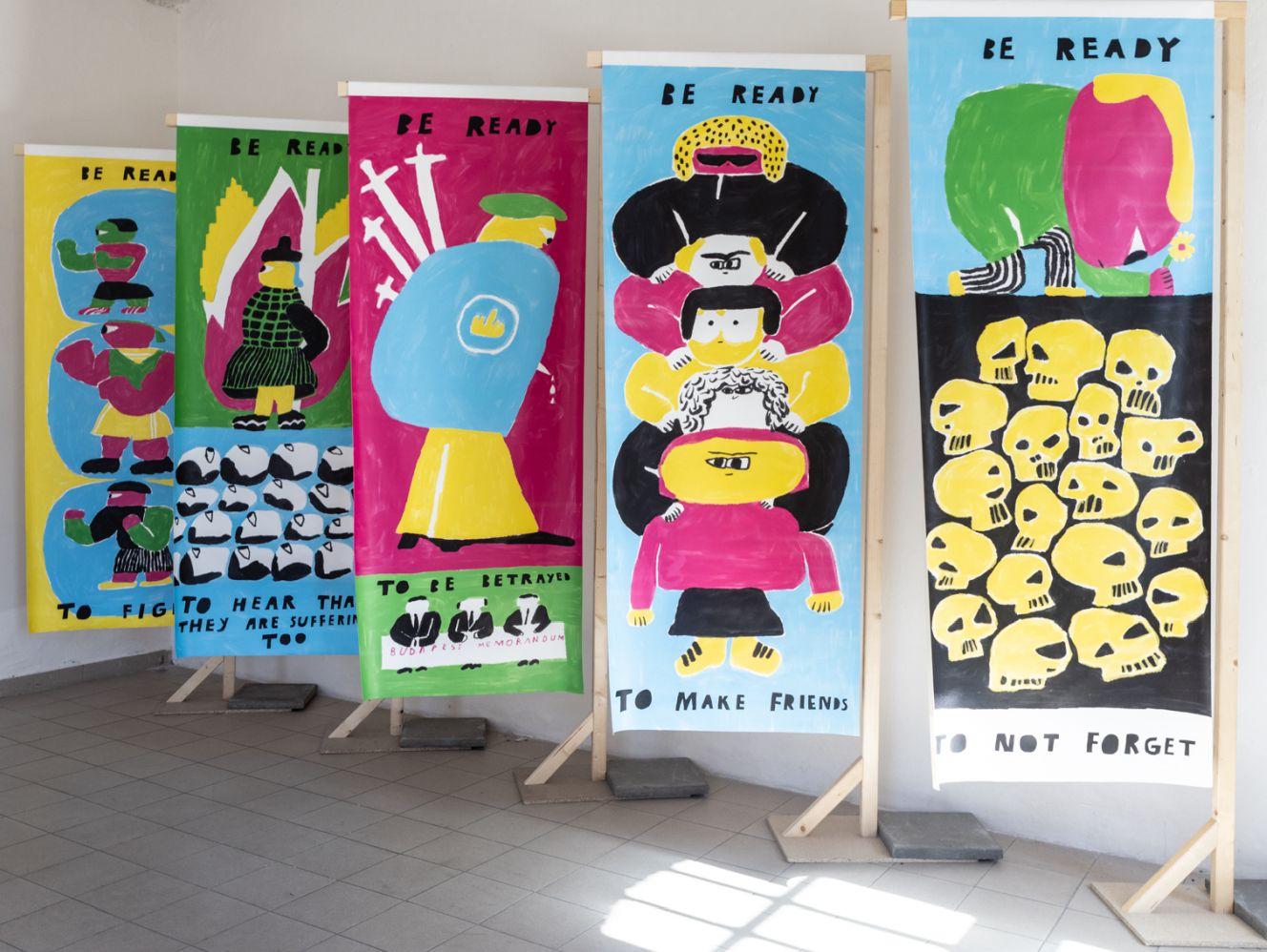 Die Ausstellung zeigt unterschiedliche Arbeiten der Künstlerin Anna Sarvira, die seit 2022 entstanden sind und sich mit dem Krieg in der Ukraine auseinandersetzen. Im Zentrum der titelgebenden, sechs Textilbanner umfassenden, Installation steht die Idee, dass man für eine sichere und glückliche Zukunft zu allem bereit sein muss. Das Projekt reflektiert die Gefühle einer tiefgreifenden Verunsicherung und des Verrats, die viele Ukrainer*innen seit Kriegsbeginn spüren. In jedem Motiv schwingt Bedauern mit und der Gedanke „Wenn ich das geahnt hätte, hätte ich mich vorbereitet.“ Daneben sind mehrere Comics von Anna Sarvira zu sehen, u.a. “The Plan”, der über den Alltag in der Ukraine erzählt. Er entstand kurz vor Ausbruch des Krieges und wurde zunächst in der Zeitschrift des Museum of Modern Art New York veröffentlicht.