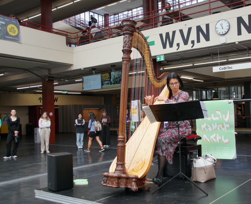 Die Harfe gilt als eines der ältesten Musikinstrumente überhaupt; Darstellungen aus Mesopotamien und Ägypten datieren auf etwa 3000 v. Chr. Die charakteristischen gebrochenen Akkorde (Arpeggien) sind nach ihr benannt. Harfenmusik wird oft als intim, magisch, beruhigend oder meditativ beschrieben. Als in der Unihalle "La valse d'Amélie" oder "Alla Turca Jazz" in weichen, fließenden Klängen zu erleben waren, blieben tatsächlich nicht wenige stehen, schlossen die Augen und vergaßen für einen Moment, woher sie kamen und wohin sie wollten.