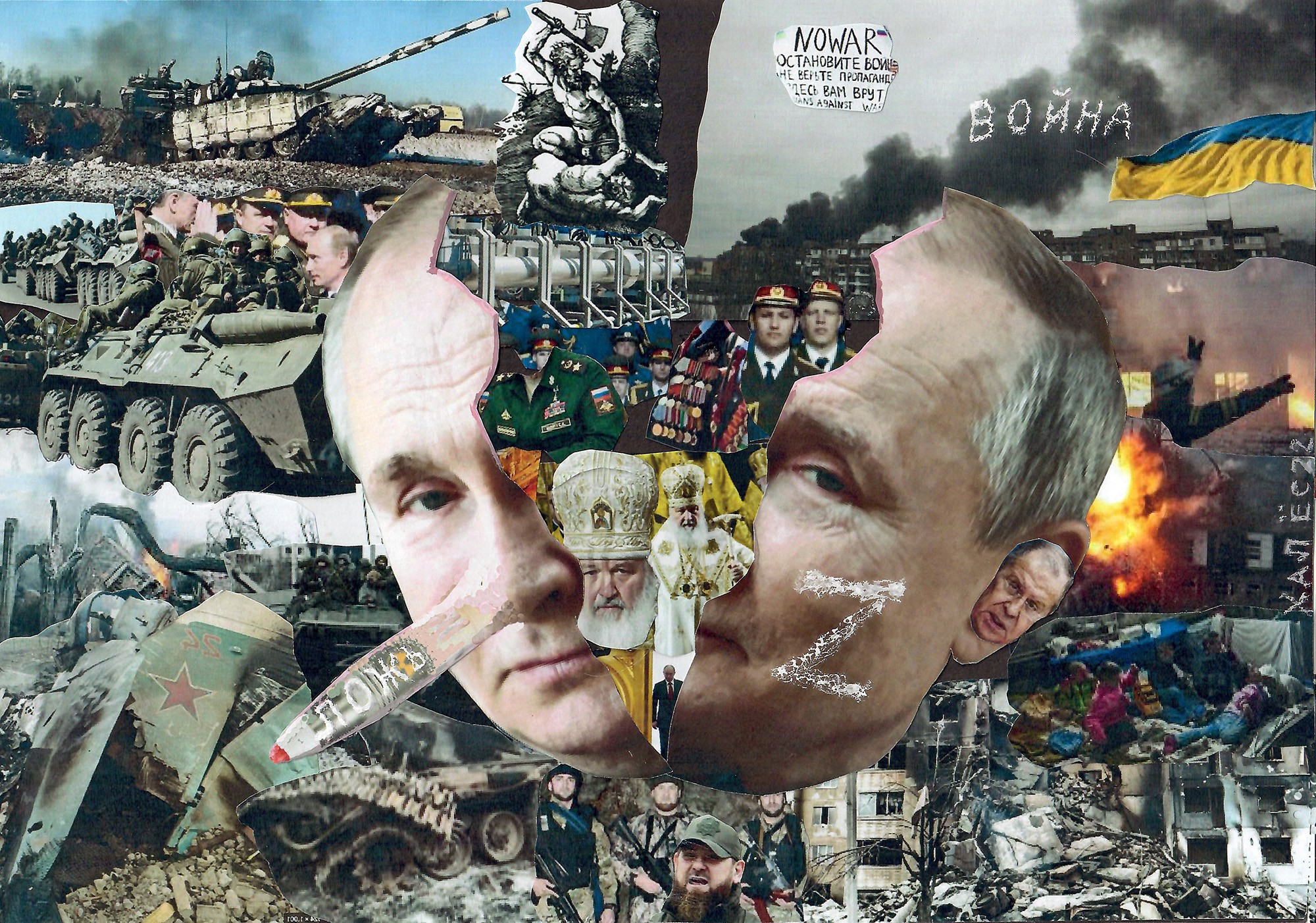 Hal Jos, der Uni Bielefeld seit Jahrzehnten eng verbundener Künstler (welcher bürgerliche Name sich dahinter verbirgt, lässt sich leicht googeln), setzt sich in seiner neuesten Arbeit mit einem Kriegsverbrecher auseinander. „Wer hilft dem GRÖLAZ?“ nennt er seine Collage. Mit „GRÖFAZ“ fasste der Volksmund in der NS-Zeit Hitlers Selbstcharakterisierung als „Größter Feldherr aller Zeiten“ zusammen. Nun ist die Frage, was hier das „L“ wohl bedeuten soll. Die aus modernster Kriegstechnik gebildete Pinocchio-Nase macht die Auflösung leicht. Hal Jos sieht seine Collage „ein bisschen in der Tradition von Hieronymus Bosch und Pieter Bruegel d. Ä., die (erdachte) Scheußlichkeiten und Bosheit im Detail dargestellt haben“.