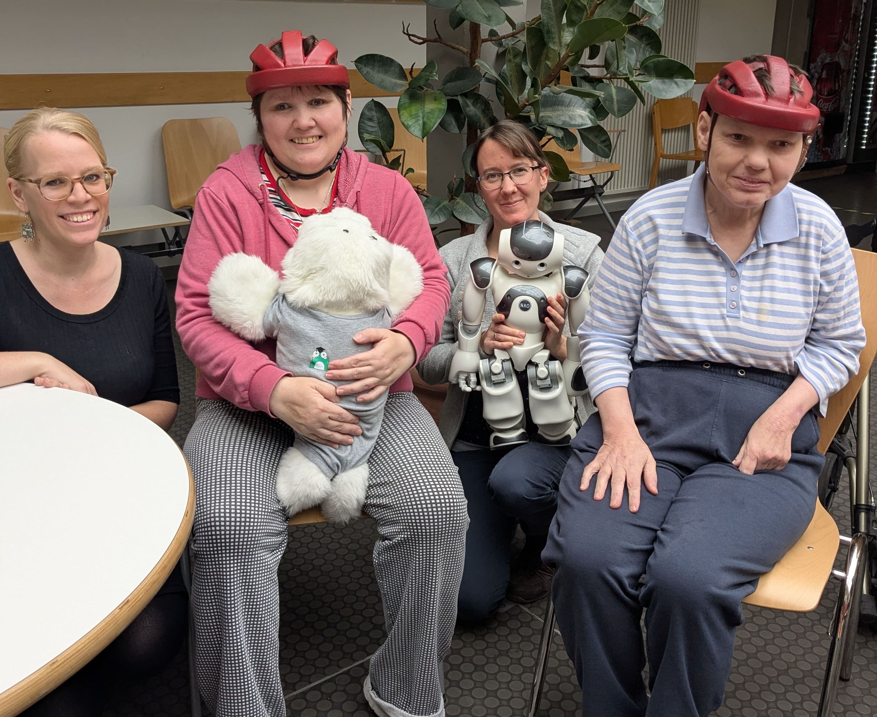 Mara Brandt und Birte Richter haben mit dem Roboter Nao und der Therapierobbe Paro aus dem Showroom "Interaktive Assistenztechnologie in Medizin und Pflege" die Werkstatt am Bullerbach in Bielefeld-Eckardtsheim besucht.