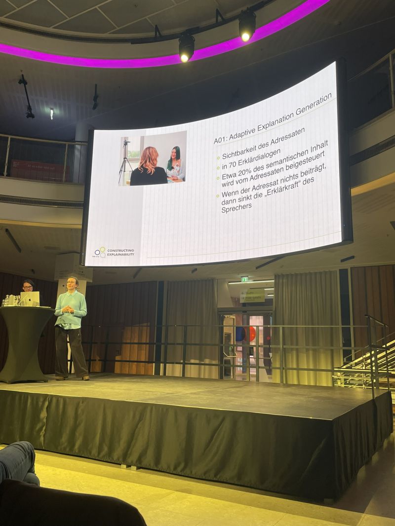 The two researchers provided insights into current research on explainable AI. They demonstrated that successful explanations require an interplay between humans and machines. Their presentation was based on findings from Projects A01 “Adaptive Explaining” and A05 “Contextualized Scaffolding in Human–Robot Explanatory Dialogue.” They illustrated how explanations can be adapted to users and how robots can support learning through tailored assistance strategies that respond to individual needs.