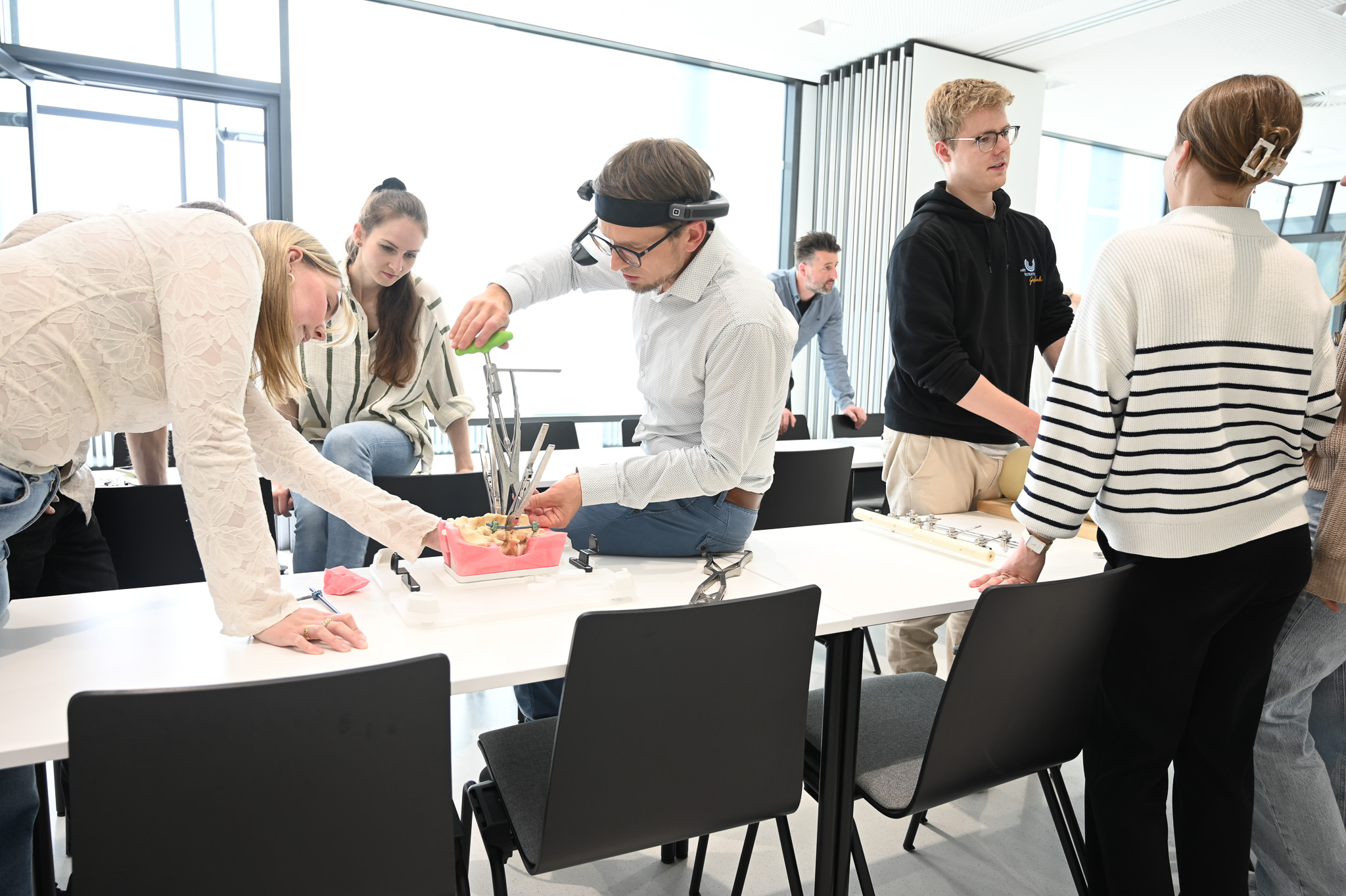 Diese Prinzipien spiegelten sich an den thematisch gegliederten Stationen wider, wo es beispielsweise um Knochenbruch- und Schraubenlehre sowie um das Stabilisieren von Brüchen in Notfallsituationen und mithilfe von Nägeln ging. Die Studierenden lösten an den Stationen Aufgaben und übten Handgriffe an Modellen aus echten Implantaten, die Szenarien vom gebrochenen Oberschenkelknochen bis zur Wirbelsäulenfraktur darstellten.