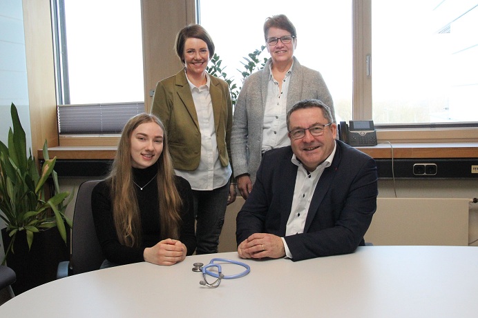 Studentin Maybritt Eschweiler (links) und Landrat Dr. Axel Lehmann (rechts) lernen sich im Kreishaus kennen. Mit dabei sind Dr. Charlotte Sahin von MED OWL (Mitte links) und Verwaltungsvorständin Sabine Beine (Mitte rechts). (Foto: Kreis Lippe)