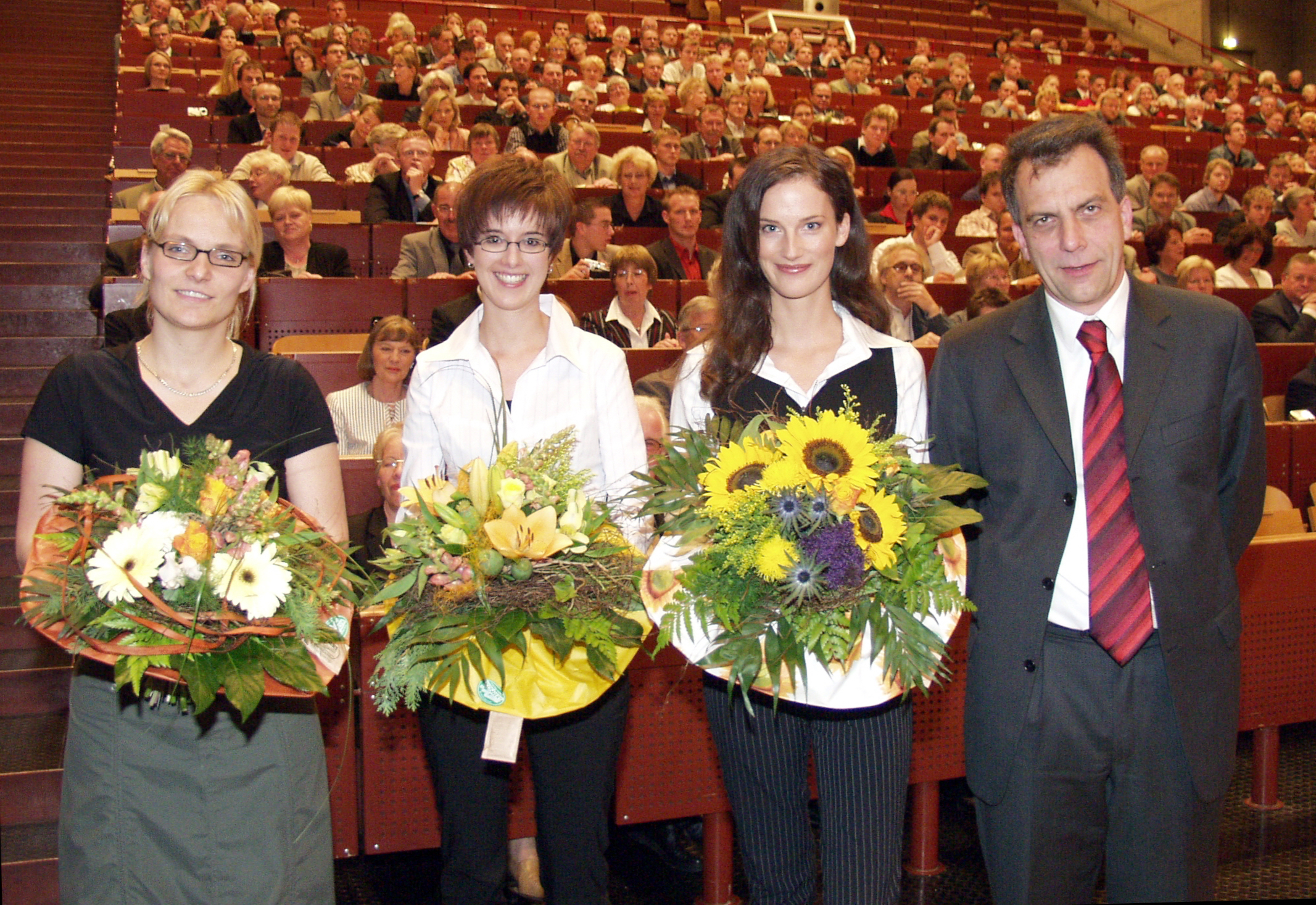 "Wandel der Arbeitswelt - Herausforderungen für den Lehrerberuf" lautete der Titel des Festvortrags, den Professorin Mechtild Oechsle-Grauvogel vom Zentrum für Lehrerbildung der Universität Bielefeld im Rahmen der Staatsexamensfeier gestern, 13. Juli, im Auditorium maximum der Universität Bielefeld hielt. Mehr als 180 angehende Lehrer erhielten ihre Zeugnisse und wurden von Prorektor Gerhard Sagerer (r.) und dem Leiter des Staatlichen Prüfungsamtes, Dr. Gerhard Kallweit, verabschiedet. Zudem sind die besten Absolventinnen (auf dem Foto von links) Susann Fegter, Christina Laag und Sarah Huch von Gerhard Sagerer ausgezeichnet worden.