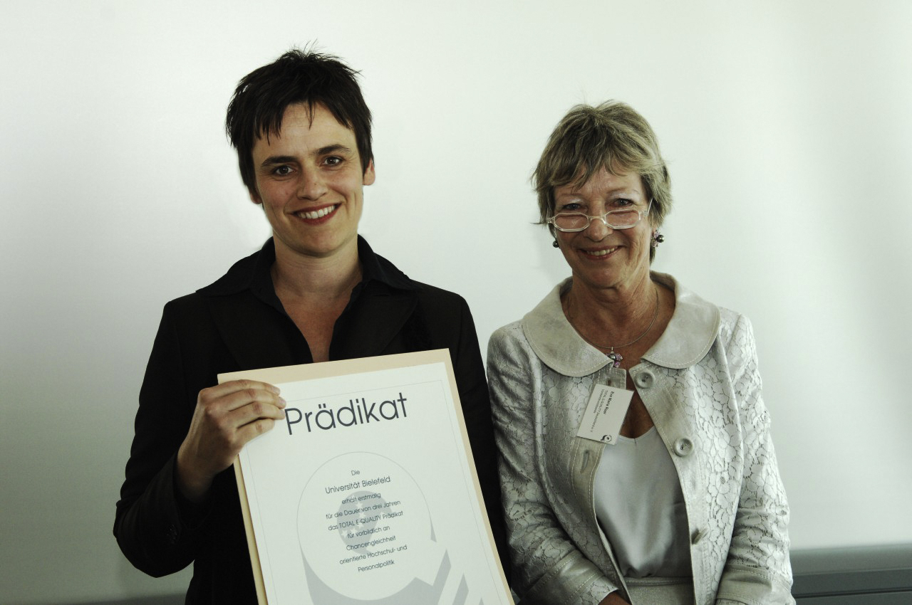 Die Universität Bielefeld hat das Prädikat "Total E-Quality" erhalten. Mit dieser Auszeichnung wurde das beispielhafte Engagement der Hochschule bei der Gleichstellung von Frauen und Männern gewürdigt. Vor allem die starke institutionelle Verankerung der Gleichstellung und eine konsequente Umsetzung der Gender-Strategien und Gender-Programme überzeugte die Jury. Die Gleichstellungsbeauftragte der Universität Bielefeld, Dr. Uschi Baaken, nahm die Urkunde in Berlin von der Vorstandsvorsitzenden von "Total E-Quality Deutschland e.V.", Eva Maria Roer, entgegen.