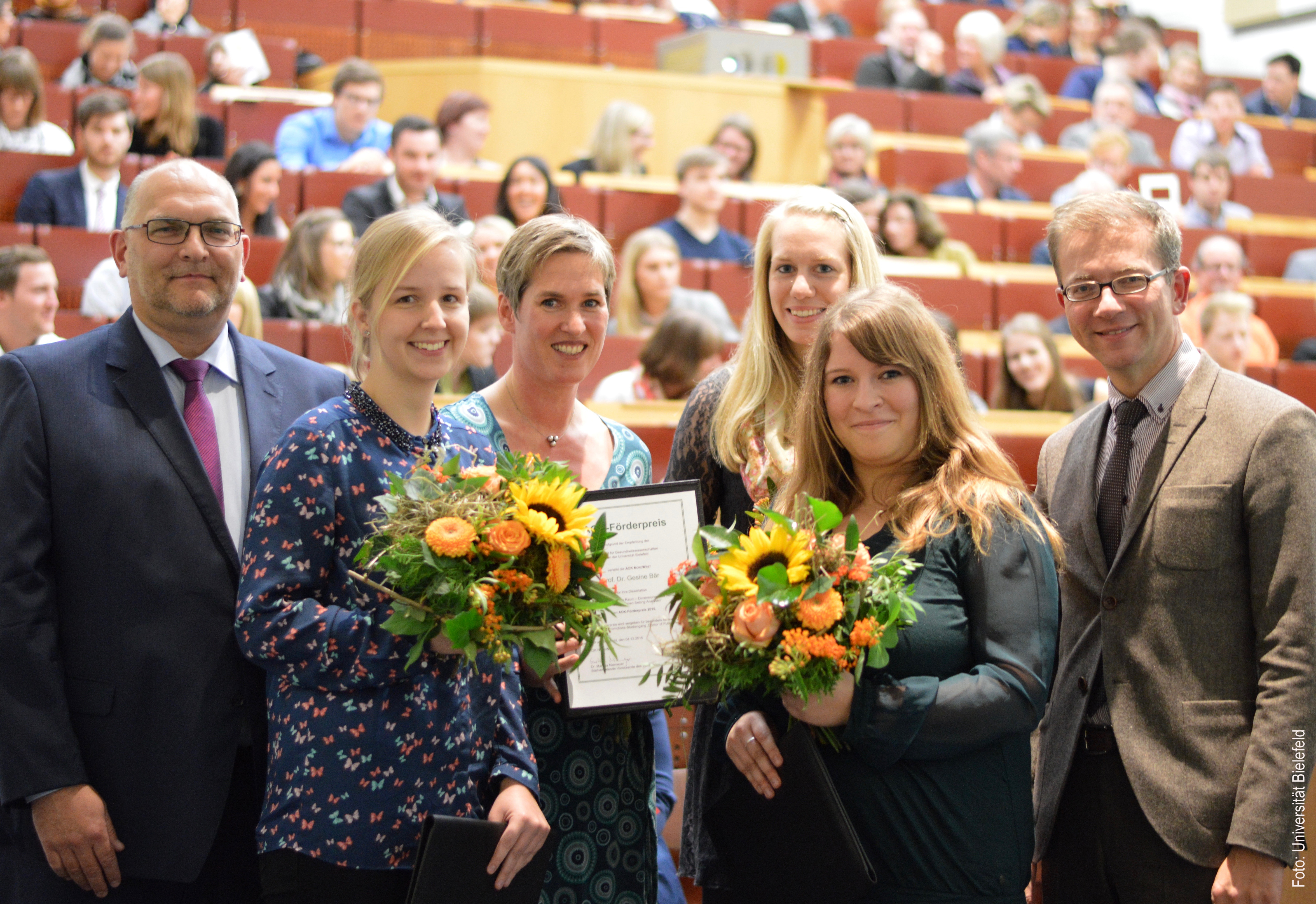 Die AOK Nordwest zeichnete auch in diesem Jahr wieder die besten Absolventen der Fakultät für Gesundheitswissenshaften der Universität Bielefeld aus. Der AOK-Förderpreis wird für ausgewählte Abschlussarbeiten vergeben, die sich mit innovativen und praxisrelevanten Fragestellungen der Gesundheitswissenschaft befassen. Die ausgezeichneten Bachelorarbeiten: Corinna Völzke: „Medizinisches Kabarett als Möglichkeit der Gesundheitskommunikation – Eine Überprüfung von Qualitätskriterien der Gesundheitskommunikation im medizinischen Kabarett am Beispiel von Dr. Eckart von Hirschhausen“; Sandra Olivia Grobosch: „Identifikation der Partizipationspräferenzen und Informationsbedürfnisse von Menschen mit Diabetes mellitus“. Für die besten Masterarbeiten wurden Kerstin Lange mit der Arbeit „Krankheitslast durch vorzeitige Sterblichkeit in NRW – Analyse der Jahre 1998 bis 2013 für Nordrhein-Westfalen und kleinräumige Analyse auf Ebene der Kreise und kreisfreien Städte“ und Hanna Schroeder mit dem Thema „Schutz des Kindeswohls als multidisziplinäre Aufgabe – Eine qualitative Studie zum Erleben von Kooperation im Netzwerk der Frühen Hilfen aus Sicht von Familienhebammen“ geehrt. Als beste Dissertation würdigte die AOK „Gesundheitsförderung im Raum – Dimensionen und Verläufe in stadtteilbezogenen Setting-Analysen“ von Professorin Dr. Gesine Bär. Gesine Bär ist Mitte dieses Jahres als Professorin an die Alice Salomon Hochschule in Berlin berufen worden. Horst-Peter Hogrebe, Leiter des Geschäftsbereichs Personal der AOK Nordwest, lobte die hohe Qualität aller wissenschaftlichen Arbeiten. „Alle Preisträger haben mit Themenauswahl und Qualität ihrer Arbeiten eindrucksvoll ihre hohe Qualifikation bewiesen.“
