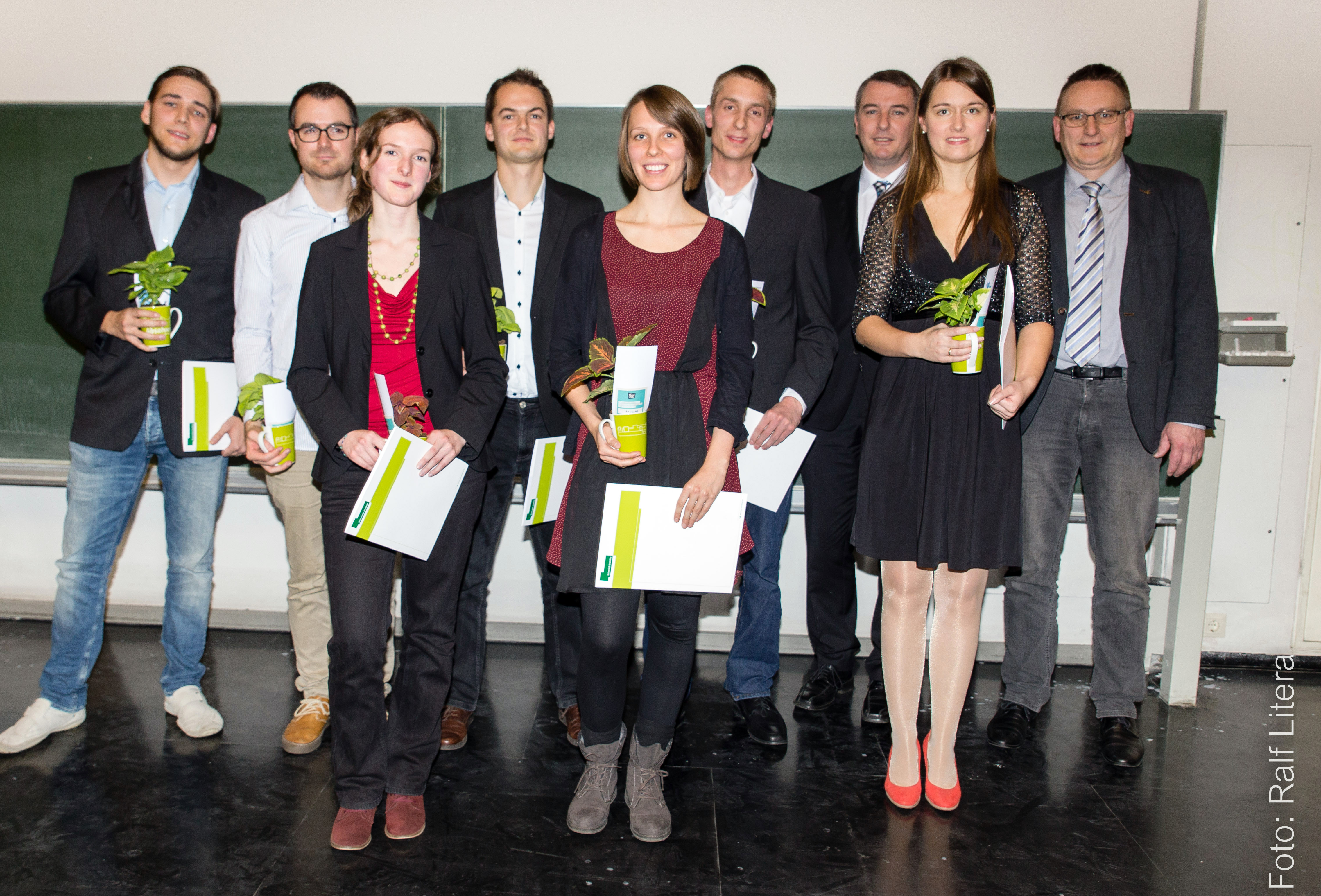 Ausgezeichnete Absolventen und zwei Vertreter der Friedrich Wilhelm Helweg-Stiftung (v.l.): Michael Florian Liebthal, Marc Otto, Eva Laura von der Heyde, Benjamin Klein, Jana Stallmann, Boas Pucker, André Heinrich (Stiftung), Nadja Alina Henke und Jürgen Heidemann (Stiftung). Foto: Universität Bielefeld/R. Litera