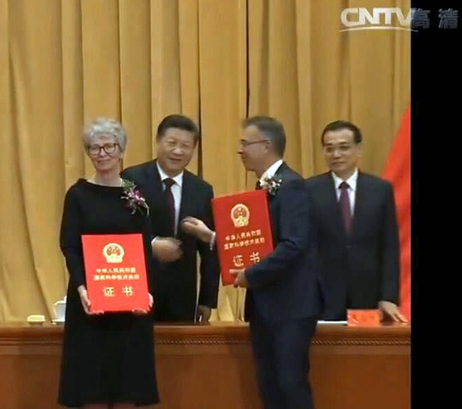 Chinas Staatspräsident Xi Jinping (2. v.l.) überreichte die Urkunde persönlich an Prof. Dr. Katharina Kohse-Höinghaus. Foto: Chinesisches Staatsfernsehen