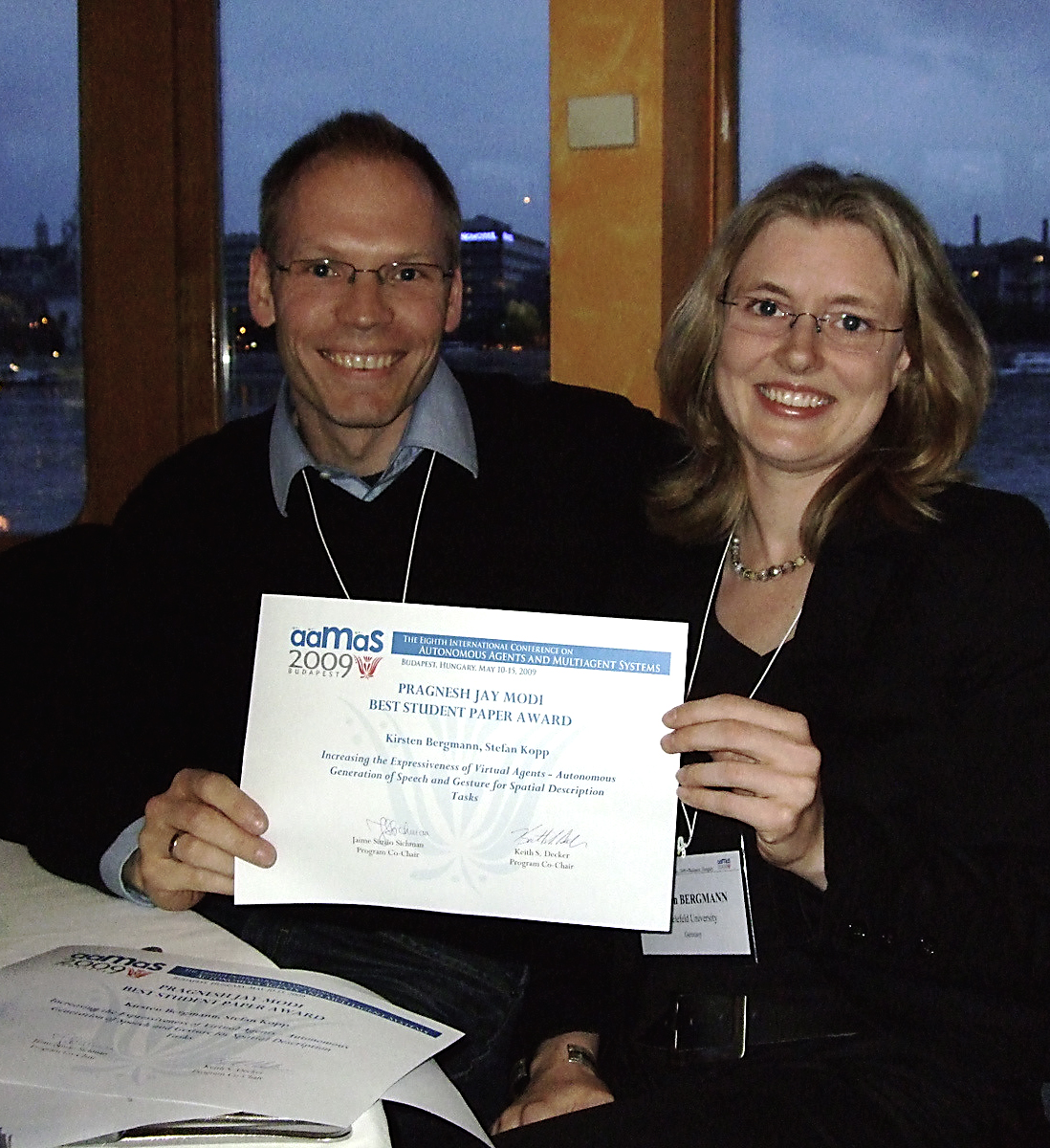 Im Rahmen der weltweit führenden Konferenz für Forschung im Bereich intelligenter autonomer Agenten (AAMAS) vom 10. bis 15. Mai in Budapest sind die beiden Bielefelder Informatiker Kirsten Bergmann und Dr. Stefan Kopp mit einem „Best Paper Award“ ausgezeichnet worden.