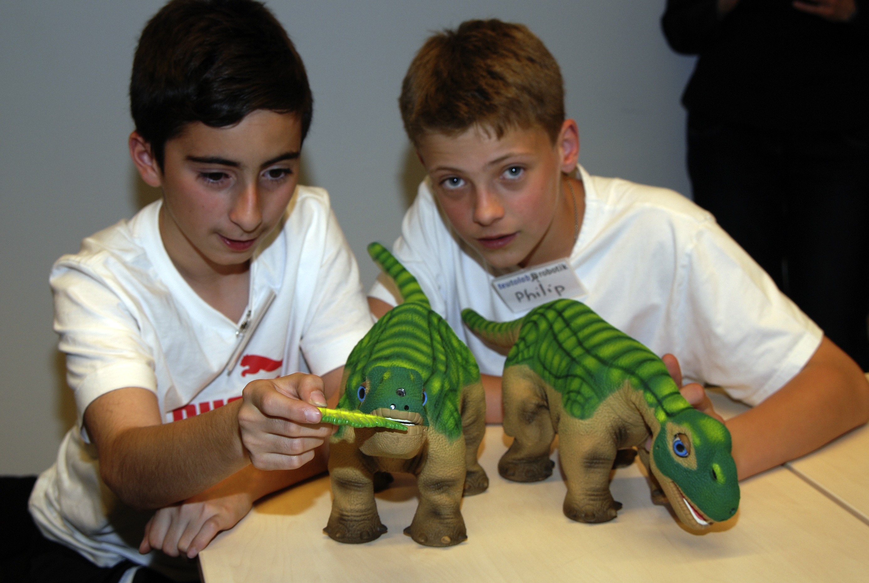 In dem Workshop „Die Roboterakademie“ machen die Schülerinnen und Schüler der Klassen sieben bis neun Bekanntschaft mit Roboterhund Aibo. Was alles in ihm steckt – das wollen sie herausfinden und stellen sich gemeinsam mit dem kleinen Roboterhund verzwickten Aufgaben. Mit dem Roboter-Dinosaurier Pleo interagieren die Jugendlichen und bringen ihm „Kunststücke“ bei.