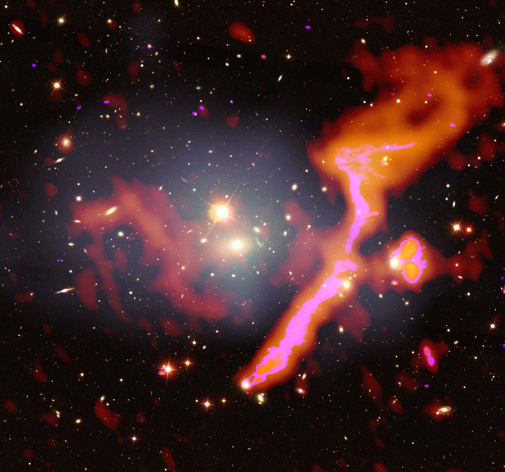 Durch die Verschmelzung zweier Galaxienhaufen werden Radioemissionen ‒ sogenannte Radiohalos ‒ mit einer Größe von Millionen von Lichtjahren erzeugt, wie Dr. Amanda Wilber von der Sternwarte der Universität Hamburg erläutert: „Radiohalos werden von extrem schnellen Elementarteilchen hervorgerufen. Mit LOFAR können wir erforschen, welche kosmischen Beschleuniger diese Teilchen erzeugen und was diese antreibt.“